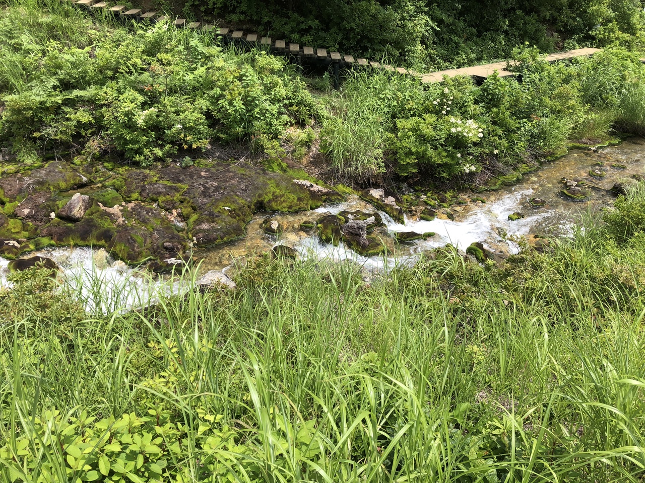 チャツボミゴケ公園は、草津の北に位置する中之条町というところにあって、強酸性の鉱泉が育んだ苔が、濃い緑で美しい。鉱泉の流れや白いガクアジサイが、より美しく見せています。酷暑でもあり、ミクロバス送迎もありがたかった。