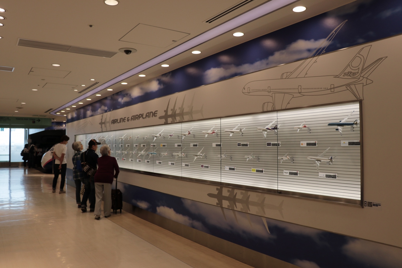 国際線ターミナルの4F、左側の方にあるスペースに羽田空港に飛来する旅客航空機の模型が展示されています。ずらーっと並べてあり、ゆっくりと眺めることができますが飛行機に興味がない人は「ふーん」程度で終わると思います(笑)