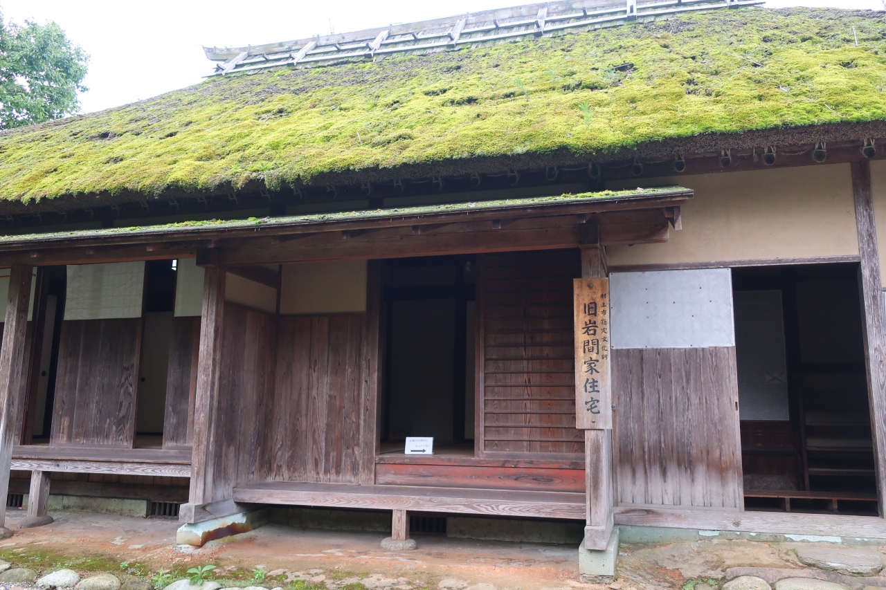 村上市役所の北東にある舞鶴公園内にある武家の住宅です。茅葺き、寄棟造りの直屋でこの屋敷も旧嵩岡家住宅同様に移築されたものです。屋敷には敷台、囲炉裏のある居間、庭に面した縁側があり、苔むした茅葺屋根が時代劇に出て来そうな住宅です。職員の方も居られますが、内部は自由に見学できます。