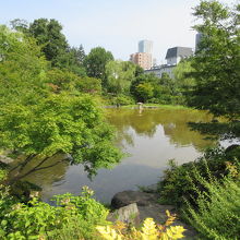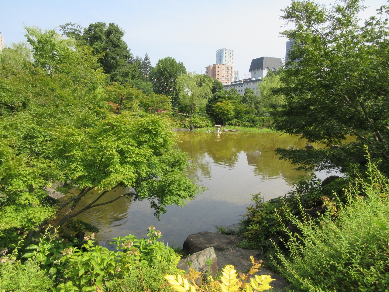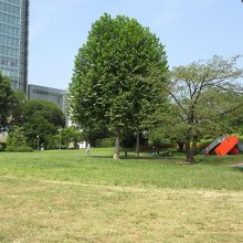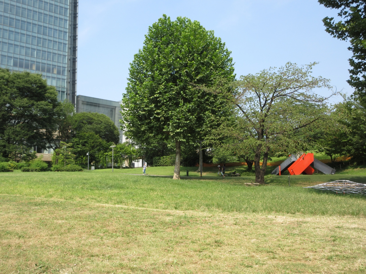 東京ミッドタウンの北東に位置する公園です。江戸時代萩藩毛利家下屋敷の庭園だった場所が公園として残っています。池を中心に長い藤棚や草が伸びている芝生広場があります。児童遊具と呼びにくいデザイン性の高いブランコ・すべり台・プレイジムが芝生広場にあるのが特徴です。池の周りの自然を残している木々が木陰を作っていてほっとします。訪れた猛暑の休日朝は、犬の散歩やジョギングをする人が少しいました。藤棚の柱にトレーニング用具を取り付けて鍛えている外国人男女がいました。六本木らしい光景だと思いました。