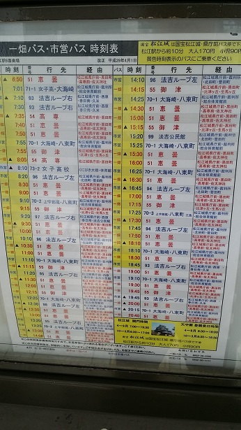 やはり一番の勢力は一畑バスで、松江市内から郊外へ向けて縦横無尽に運行しており島根町、美保関、大東、玉造、八雲など遠路にも出ているというTOPの強さをいかんなく発揮しております。