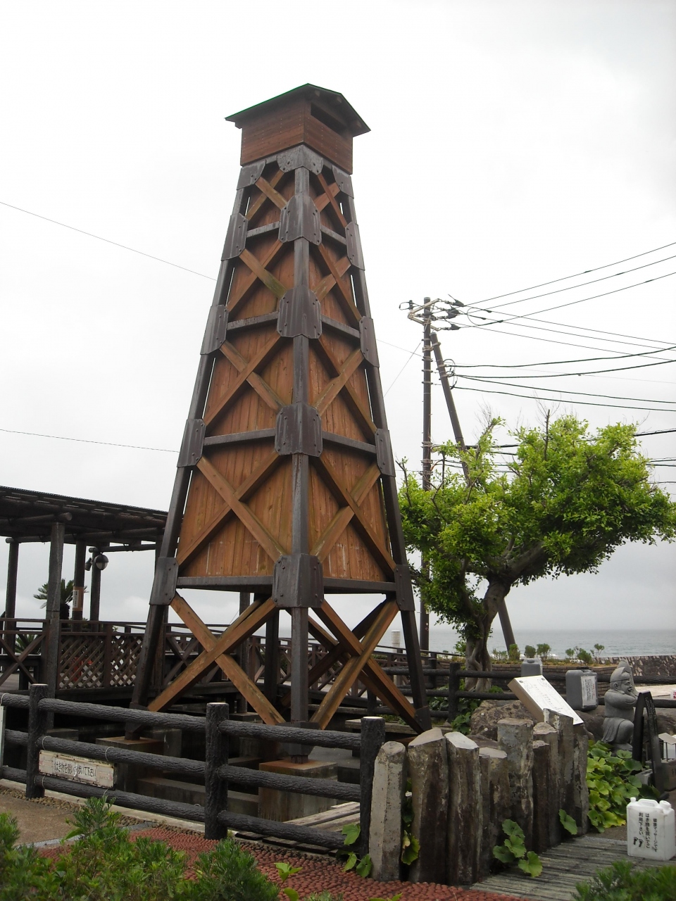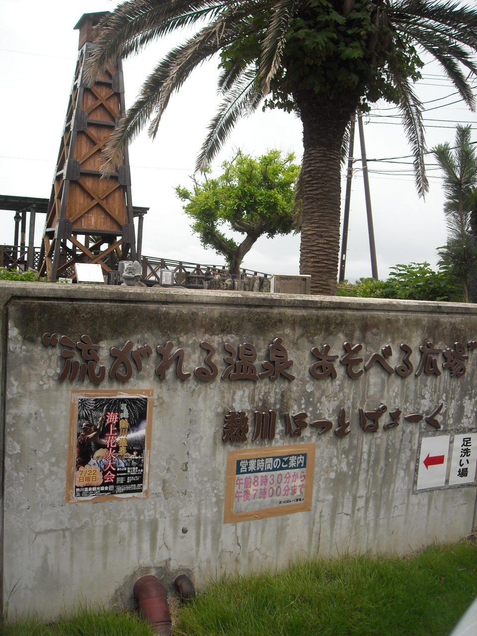 河口に櫓が組まれちょっと油田のような趣があり、天辺にジミー・ディーンがいれば面白かったのに・・・・。大掛かりな舞台装置の割には足湯でした、砂湯であればもっとインパクトある観光になったかもしれませんが?