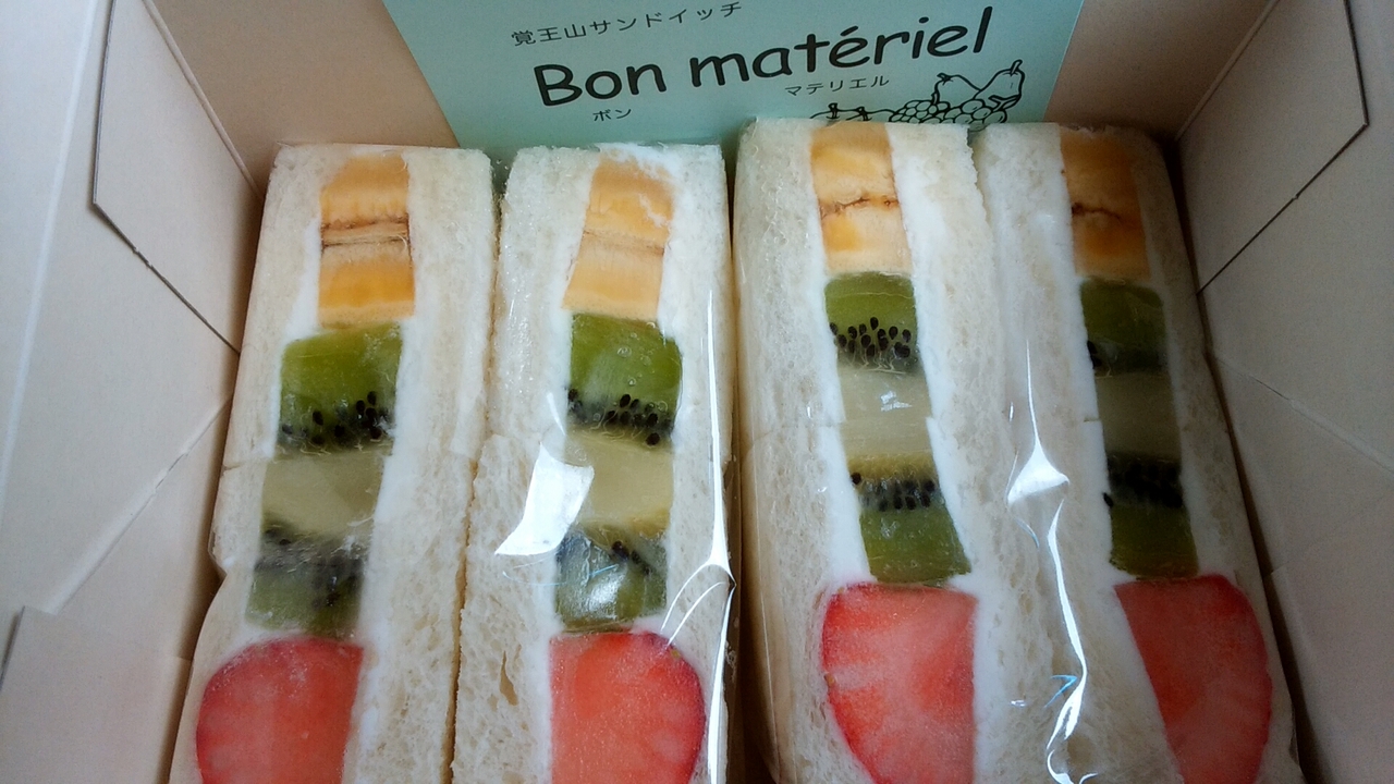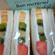 キウイ、イチゴ、バナナと生クリームのサンドで、パンよりもフルーツが分厚いです。