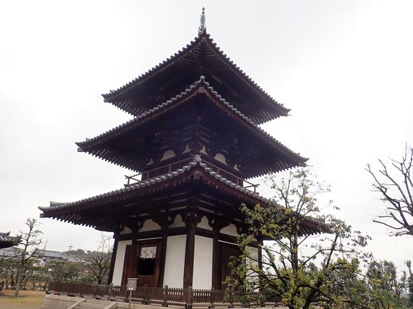 ここには現存する最古の三重塔(国宝)があり、池の前で美しい姿を見せています。