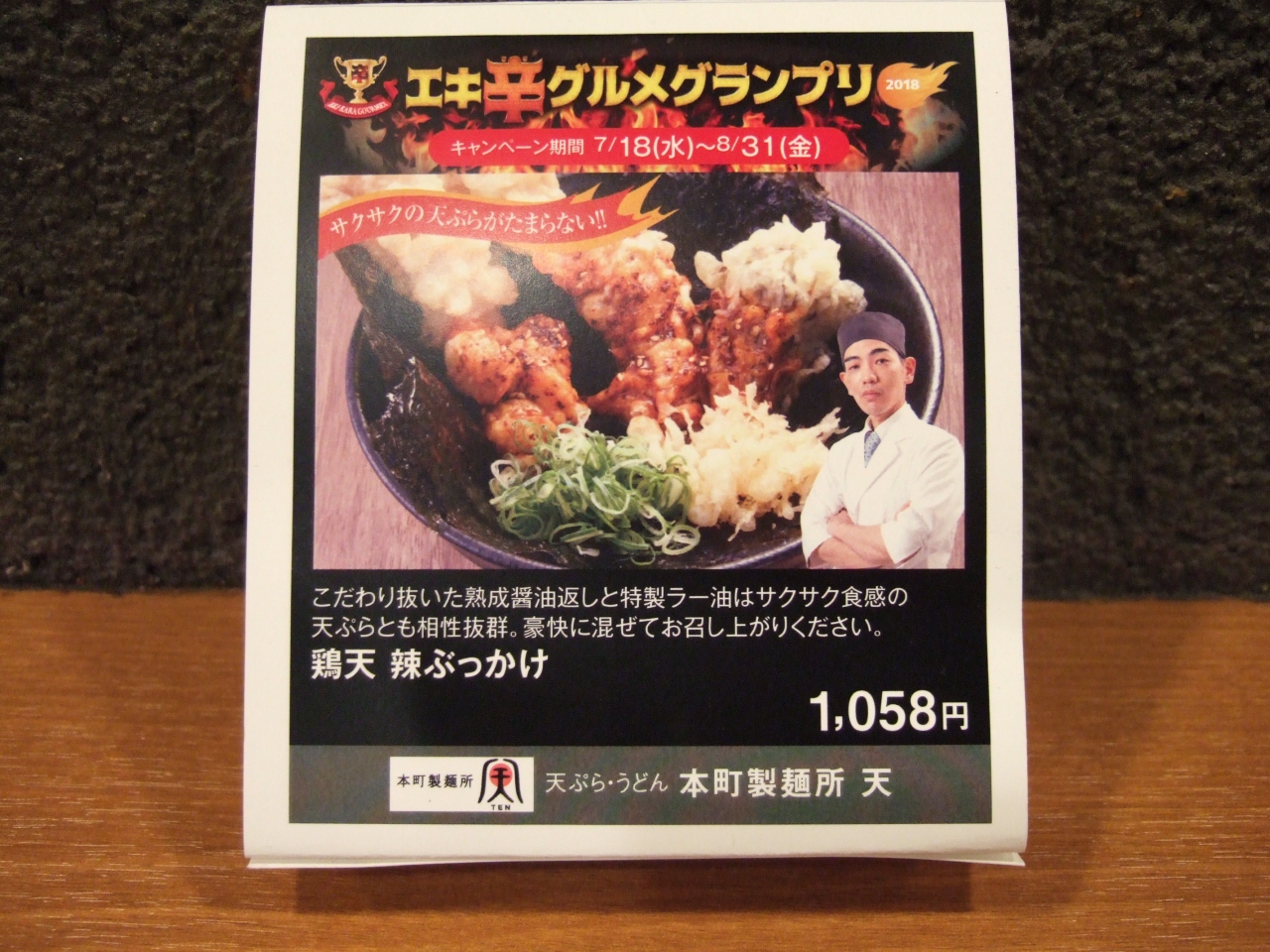 新大阪駅の地下鉄に近い、新なにわ大食堂にあります。飲んだ後の〆に入り、季節限定の鶏天辣ぶっかけをオーダーしました。