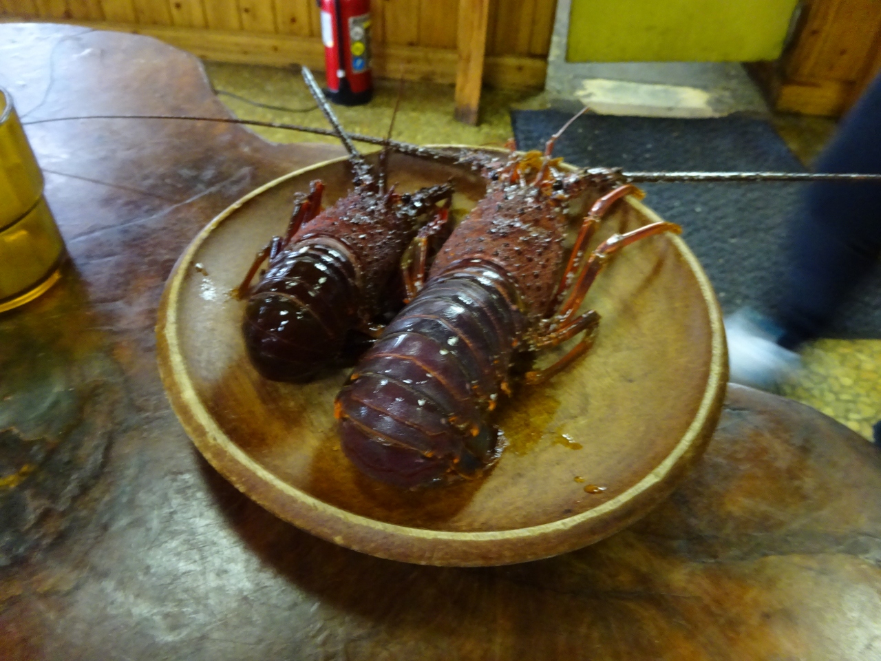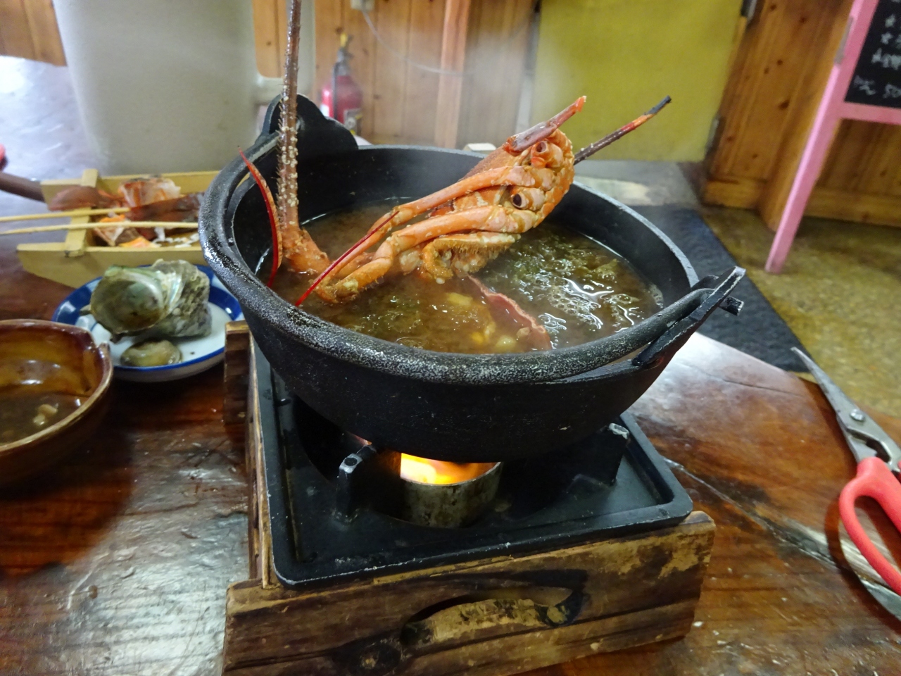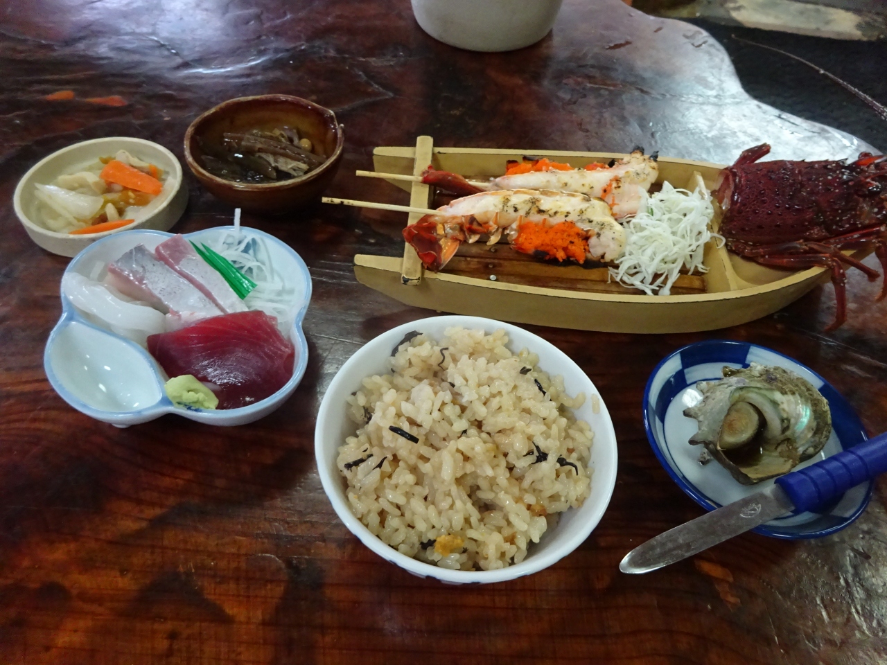 まず最初に、生け簀から複数の伊勢海老を出してきて、どれにするか選びます。その時点で値段が決定。そして、定食が全部出てきたあと、伊勢海老の頭の部分だけ一旦持って行かれ、それがあとでみそ汁の具になって出てきました。