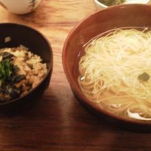 麺は細ストレート、スープの出汁は不明だが非常に旨い!そのまま戴いても良し、卓上の醤油や味噌山椒で味付けをしても良し。