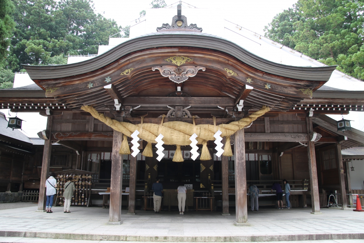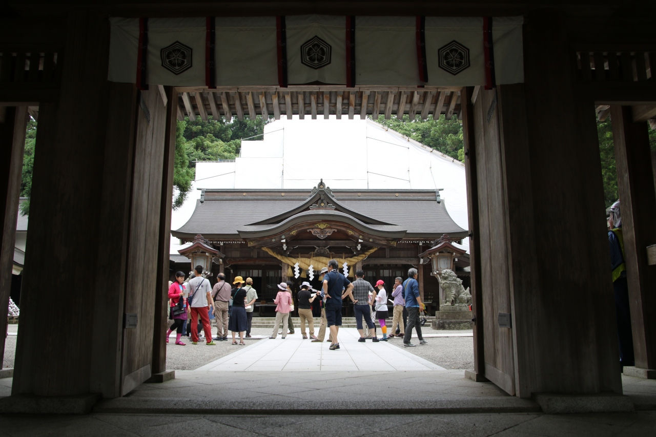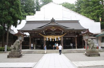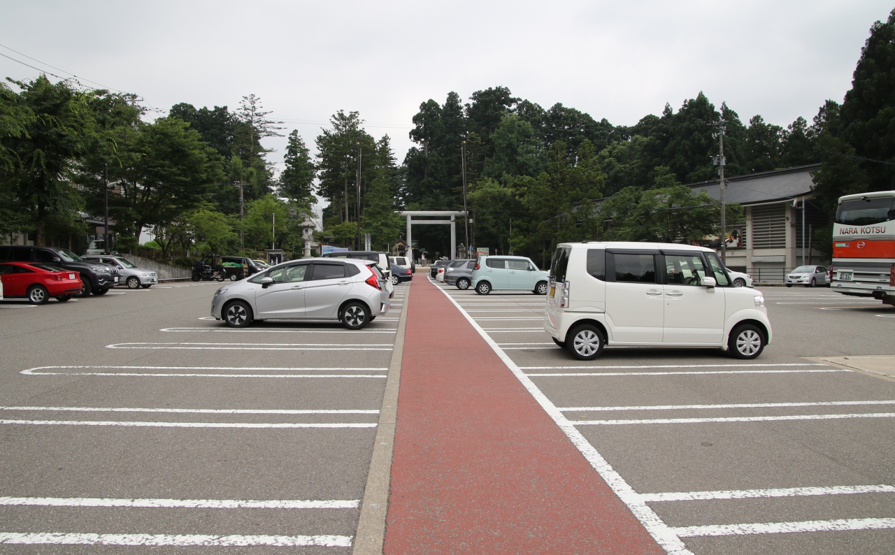 広い駐車場が完備されているので自家用車での参拝には便利です。駐車場から拝殿まで至近距離にあり長い参道石段を歩く必要はないので高齢者の方には比較的参拝しやすい神社です。本殿は現在工事中で白い覆いがかかっています。