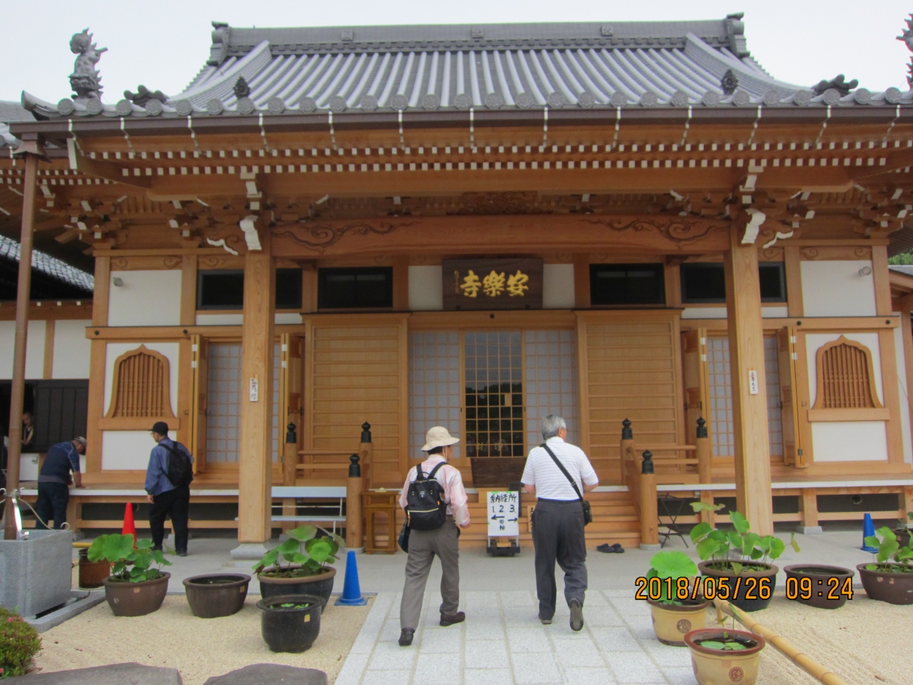 曹洞宗のお寺です。 ご本尊は「阿弥陀如来」です。 本堂を正面にした階段があり、2本の石柱には、大光山・安楽寺と刻まれています。 本堂の手前には、四国の地形をかたどった「お砂踏み霊場」があります。 居ながらにして簡単に、四国巡拝ができる、素晴らしいアイデアです。 弘法堂には、たくさんの「南無弘法大師」と書かれた幟旗が立っていました。