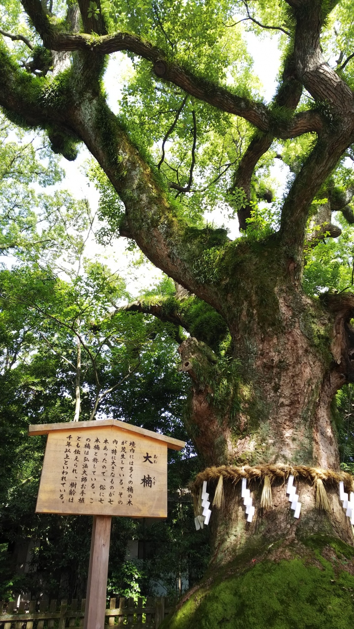大楠の周りには囲いがあって、触ることができないようになっています。触れてパワーを貰うっていうことではなく、どちらかと言えばパワーを降り注いでもらうような感じです。見上げると1000年生きている大木なので相当大きいです。