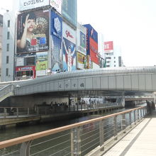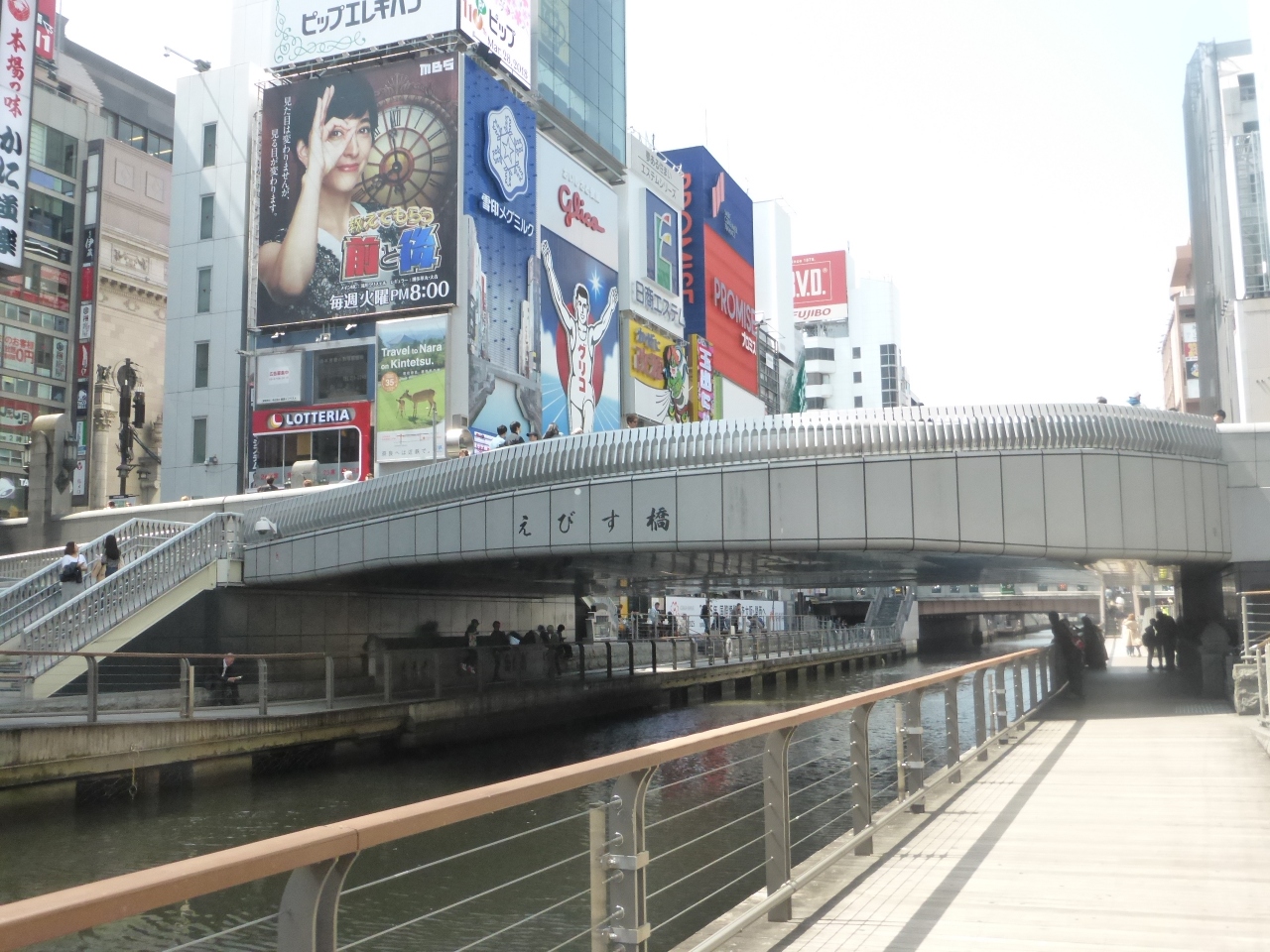遊歩道から見る建物の風景はいかにもミナミらしくていいんですが、もう少し道頓堀川が綺麗になると嬉しいですね。
