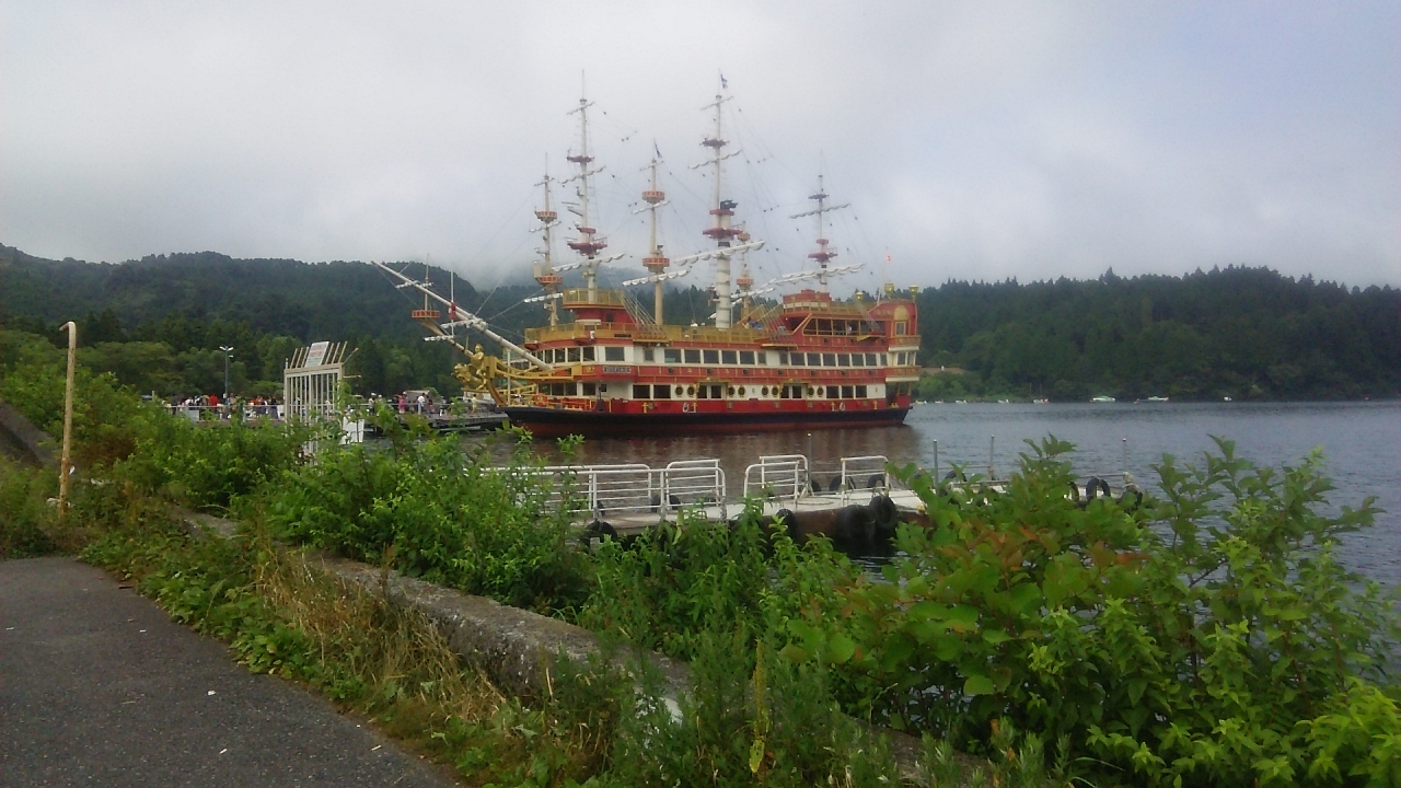 箱根新道を一気にのぼり、芦ノ湖まで来ました。今年の夏は特に暑いのに、湖上を渡ってくる風は気持ちが良い。残念ながら富士山は見えなかったのですが、木々に海賊船が映えてとてもきれい。午前中で人も少なくて快適でした。