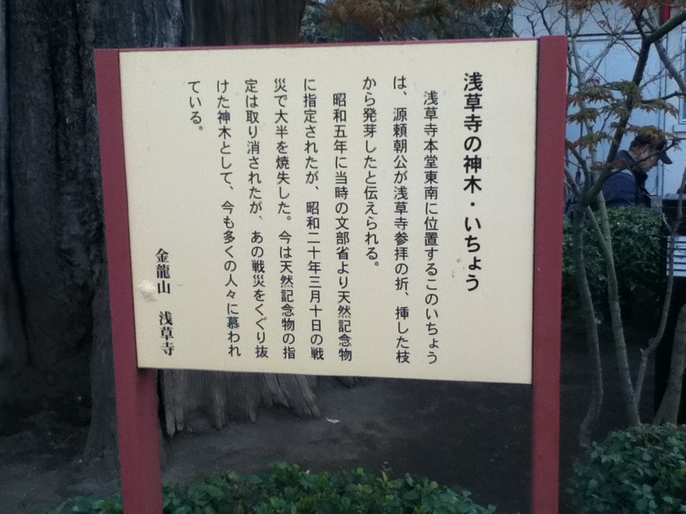 浅草寺本堂の東南にこちらの銀杏がある。数人が写真を撮っていた。お勧めの点は、この銀杏は源頼朝公が浅草寺参拝の時に刺した枝から発芽したと言われていること、昭和20年の繊細で大半を焼失し上部の幹はなくなってしまたが、今でも生き続けていて大きく立派であること、戦災を潜り抜けたことから神木となっていること、災難に耐え800年間も生き続けていている大きく貴重な銀杏であり特に銀杏や植物に関心のある人や、神木にお参りしたい人にとっては訪問する価値がることである。