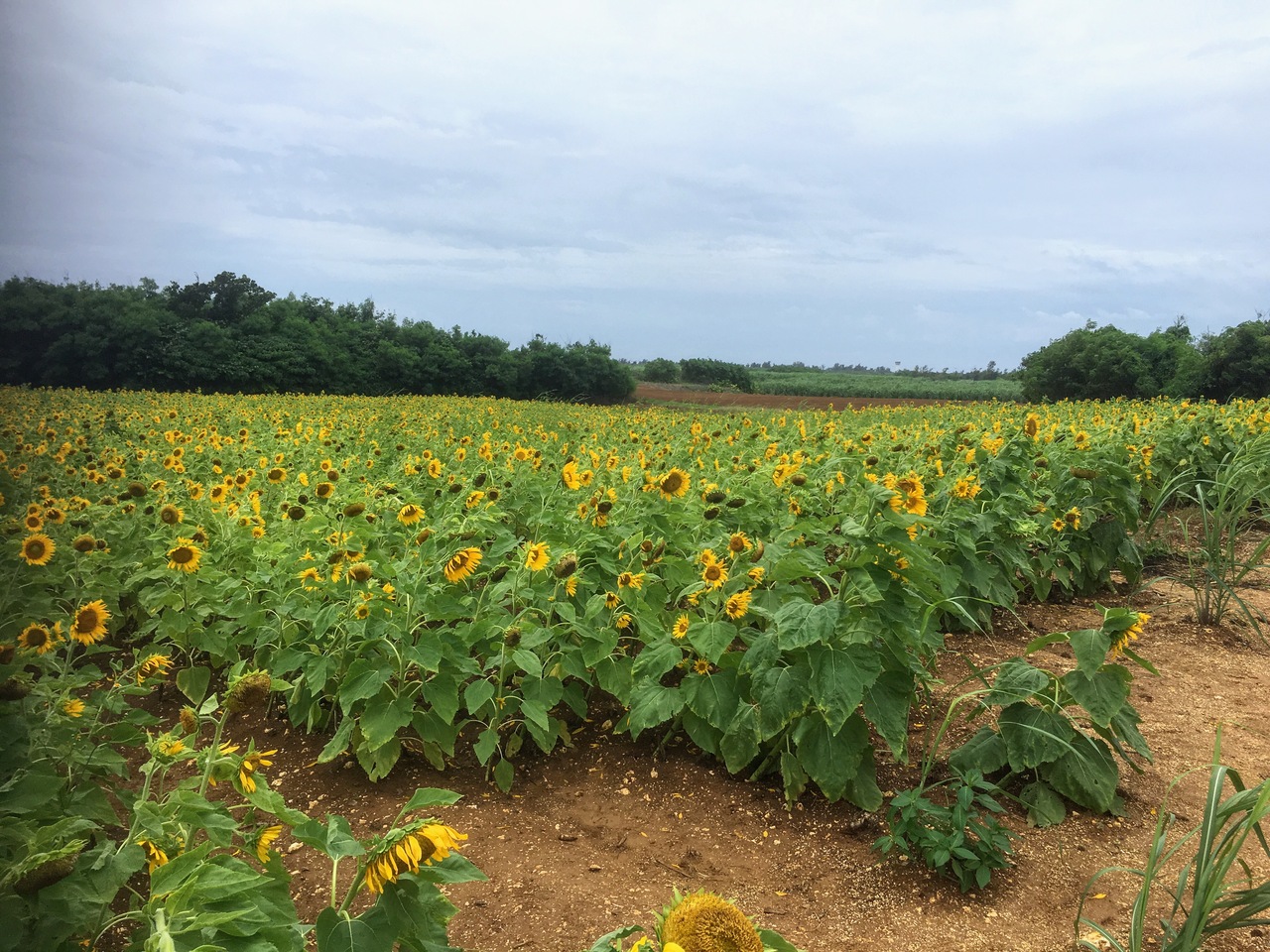 サトウキビ畑の中をまっすぐな道が広がります。ひまわり畑もありました。