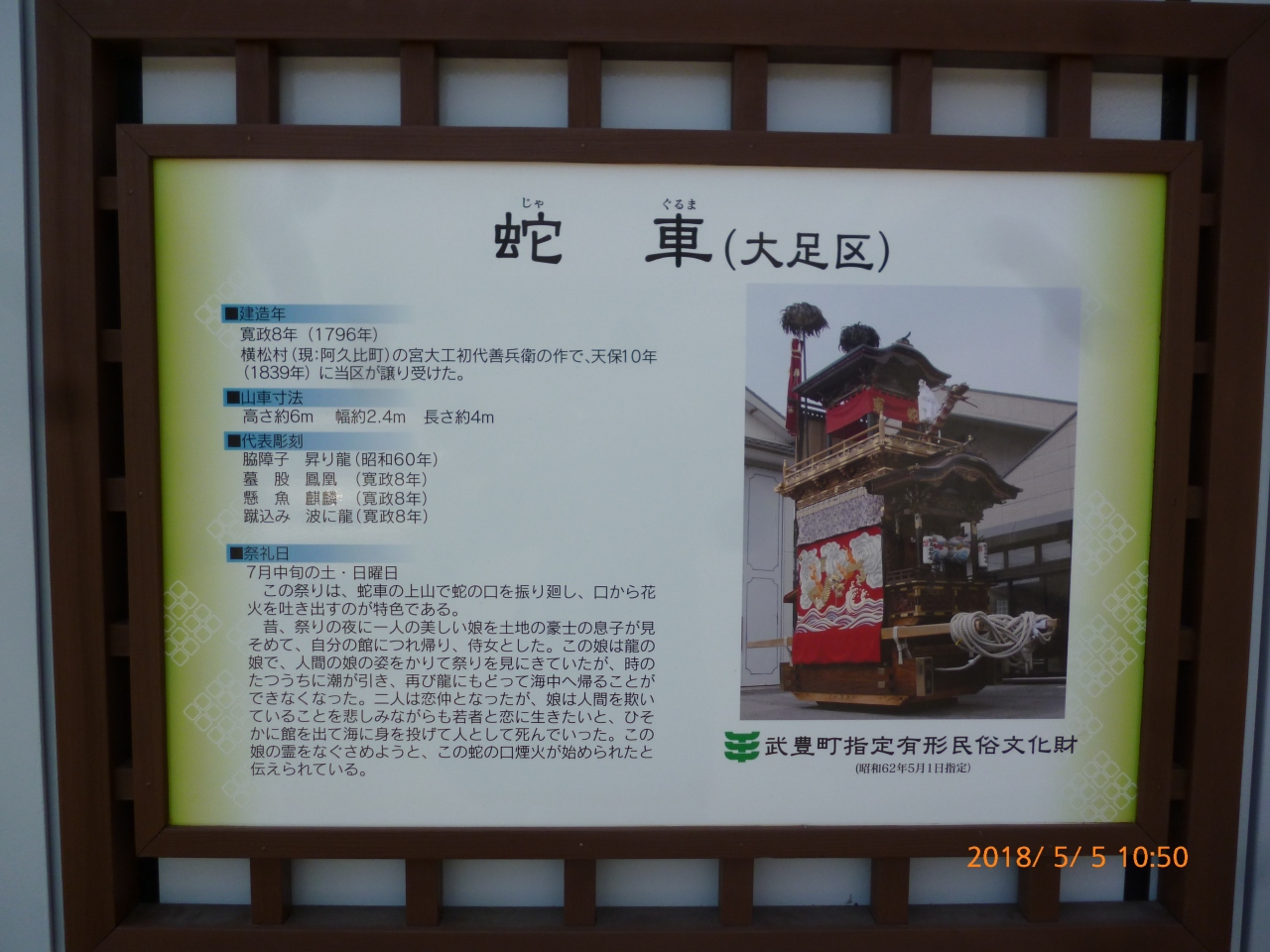 曹洞宗のお寺です。 ご本尊は、大通智勝仏です。 このお寺は、源義朝供養のための草庵が始まりだそうです。 ここの弘法堂は、本堂に比べて新しく作られています。 弘法堂の脇には、瓦寄贈の案内がありました。 本堂の屋根も新しくなりそうです。 お寺の駐車場の向かいには、お祭りで使う「蛇車」の山車の格納庫があります。 帰り際に山門越しに見える、「蛇車」の格納庫がとても素敵です。 お祭りも見てみたいと思いました。