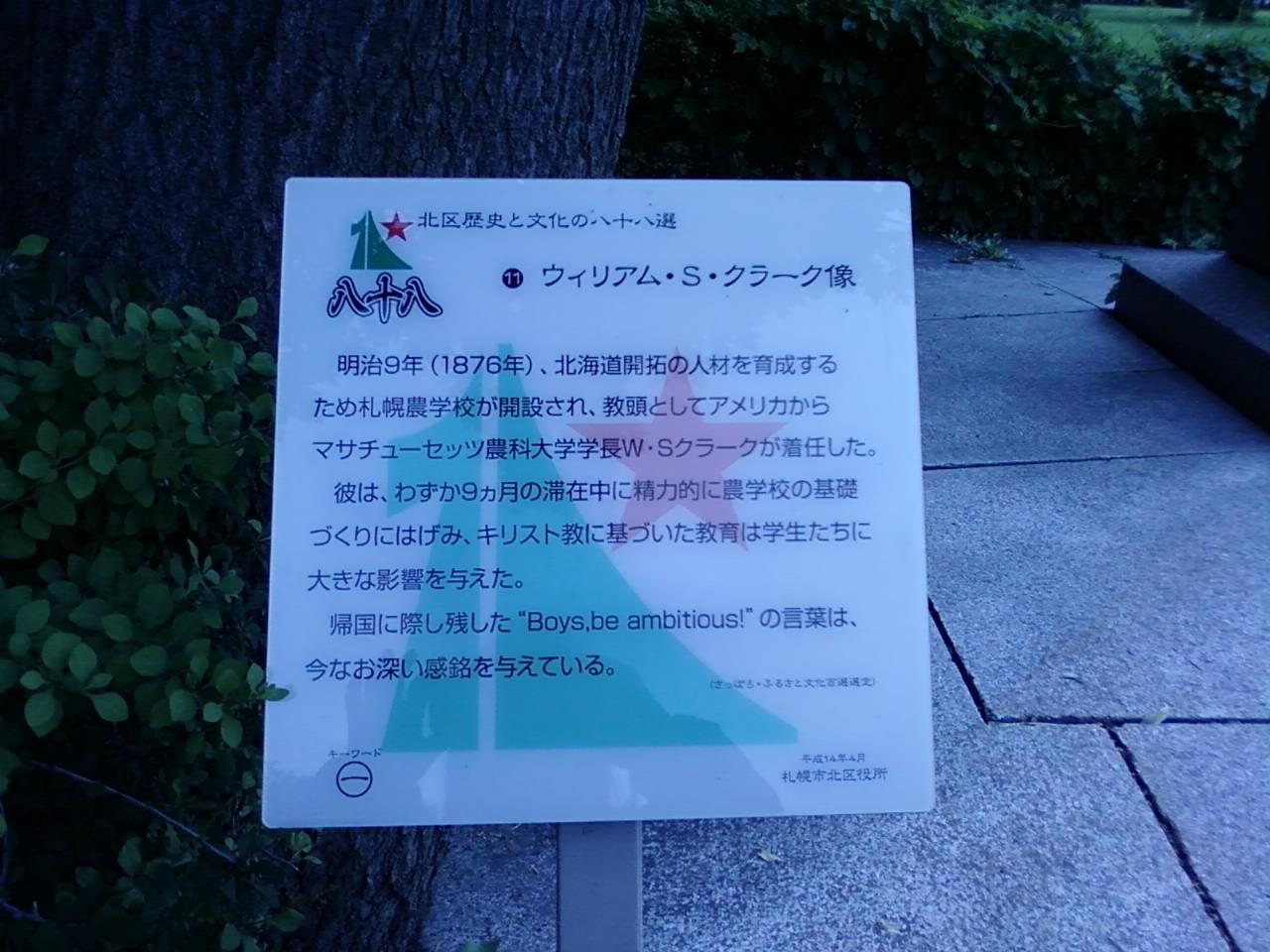 ここのクラーク像は、北海道大学のキャンパス内にあります。多分右手を伸ばしたポーズのクラーク像の方がもっと有名なのかもしれませんが、それは「羊が丘展望台」に行くしかなく、札幌市内で時間があまりない人は、札幌駅から15分くらいで行けるこちらの像をお勧めします。台座にはBoys,Be Ambitious(少年よ、大志を抱け)の文字が刻まれていて、北海道ではあまりに有名な人ですが、彼が19世紀後半、キリスト教に基づいた教育を日本の農学校にもたらしにアメリカからやってきた時、わずか9か月の滞在でこれほどまでにその言葉が学生たちの心に届いたとはすごいです。