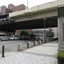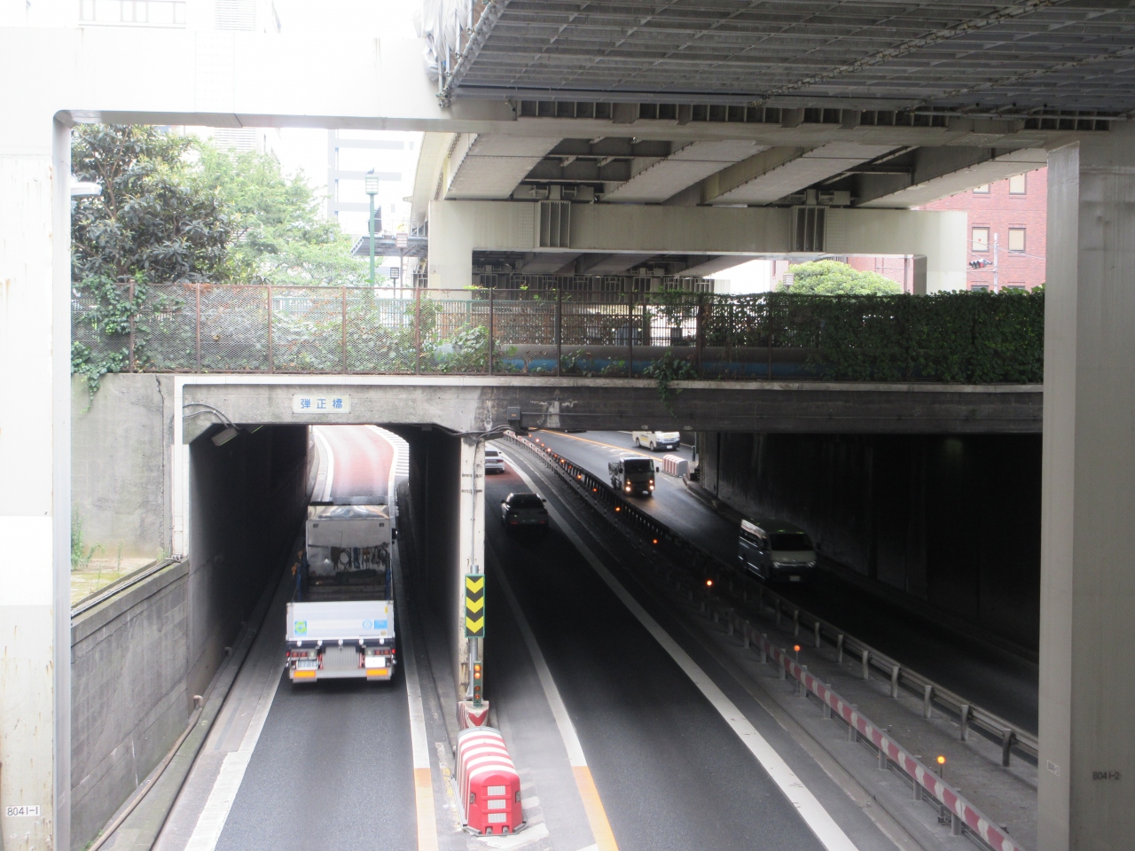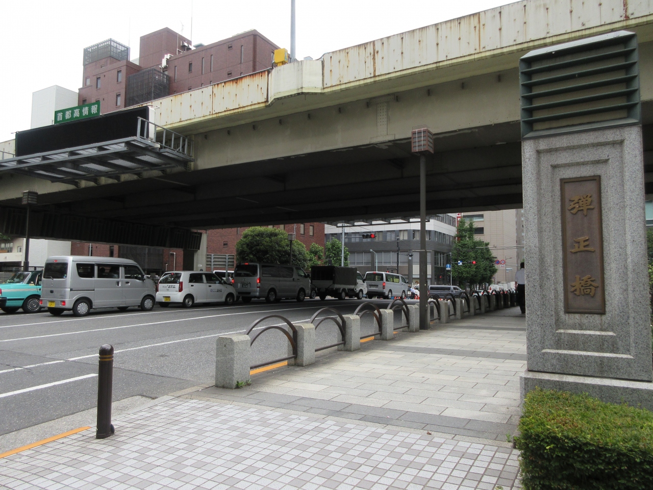 鍛冶橋通りの京橋IC出口のそばにある橋です。橋の上下を高速道路が走っています。交通量が多く、平日午前に歩道を歩く人はサラリーマンでした。埋め立てられた楓川に架かる橋です。京橋プラザの向かいにある三つ橋跡の説明板に弾正橋についても記されています。隣の松幡橋から弾正橋を見ると弾正橋が高速道の上に架かっていることがよく分かります。歩道の横に楓川弾正橋公園があり喫煙エリアでタバコを吸うサラリーマンたちが集まっていました。近くの他の橋と雰囲気が異なるのが特徴です。