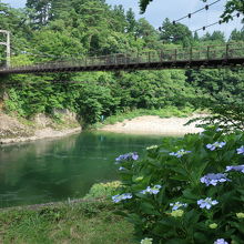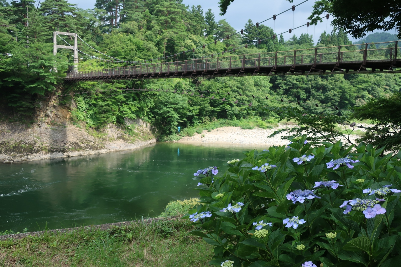 特に新潟の橋50選に選ばれた鷹ノ巣吊り橋の周辺は7月だと、まだ紫陽花の花が綺麗で、吊り橋が荒川峡谷に映えます。
