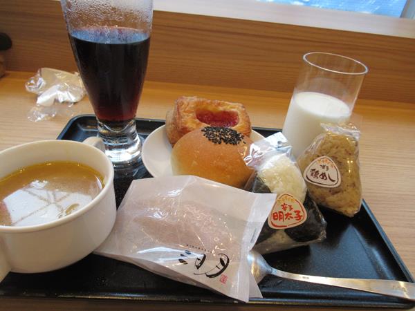 明太子おにぎりや鶏めしおにぎり、パン、野菜スープやドリンクが提供さていました。この他に三日月屋のクロワッサンやJAL特製焼きカレーパンもあるようです。