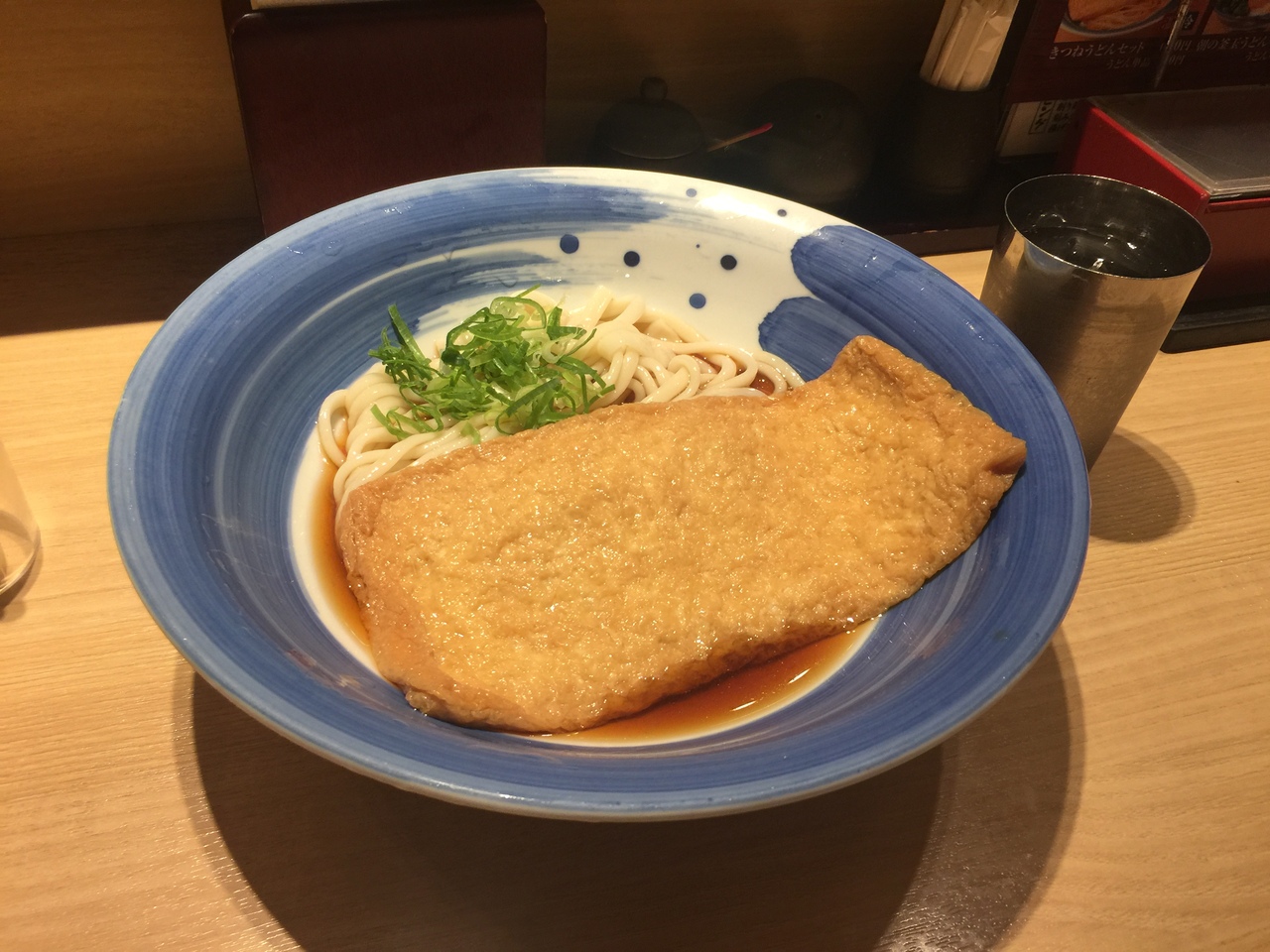 食べたのは冷しきつねうどん500円!お揚げがかなり大きくてイイですね(^ ^)