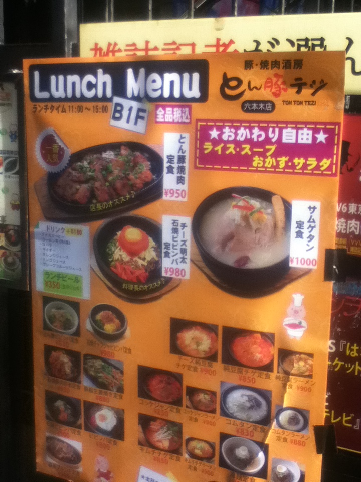 六本木駅北西の道路沿いにある焼き肉屋さん。店頭には料理の写真が載った看板が掛けられている。店内は広く、テーブル席や座敷がある。平日午後、数組のお客さんがいた。ランチのとん豚焼肉定食を食べたが、豚焼肉は適度に焼かれ比較的柔らかく、ライス、カクテキ、スープ等が付いて全体的にまぁまぁ旨い。値段はやや高めであるが焼肉の種類は多いので、この界隈で焼肉を食べるにはいいかもしれない。