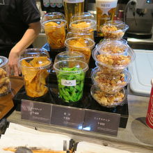 軽食を販売しているが、唐揚げ、タコスチップ、枝豆、ミックスナッツなどのテイクできるメニューもある。