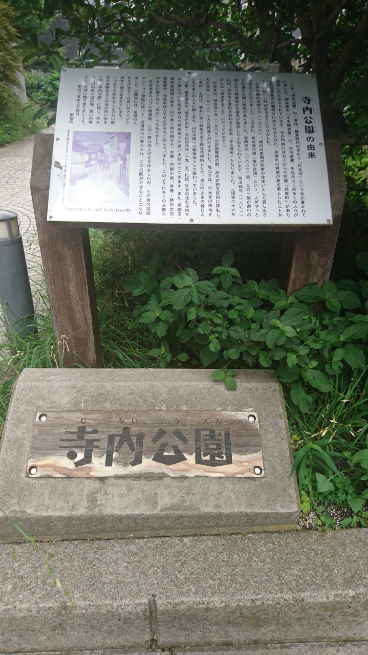 神楽坂の横丁を散策していると寺内公園という小さな公園を見つけました。その名の通り、この公園はかつて行元寺というお寺があった場所に建っているそうです。説明板によると、昔からこの地域は道が入り組んでいたらしく、簡単に目的地に行けるような感じではありませんでした。