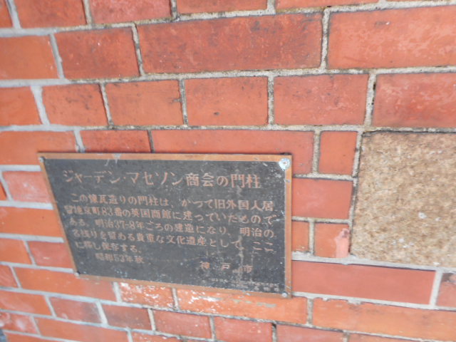 神戸の北野地区の観光で北野の広場を訪問しました。広場の入り口に古そうな赤煉瓦があったので近寄ってみると、鉄板があって、マセソン商会の門柱とありました。調べてみるとイギリスの有名な商会の建物からの移築だそうです。鉄板はよく見ないとわからないけど、門柱は雰囲気もあってよかったです。