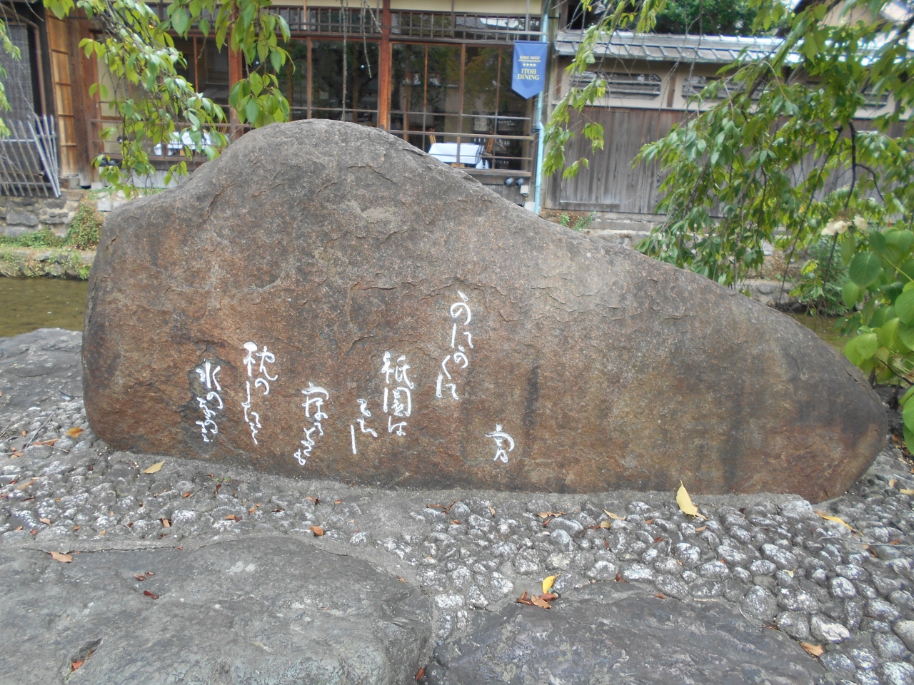 祇園白川地区の白川の畔に歌碑があります。吉井勇は大正期ー昭和期の歌人です。祇園に住んでいたことがあり、とても愛着を持っていたそうです。碑には「かにかくに祇園はこひし・・」の文字が刻まれていました。石の台座もある横長の立派な碑です。