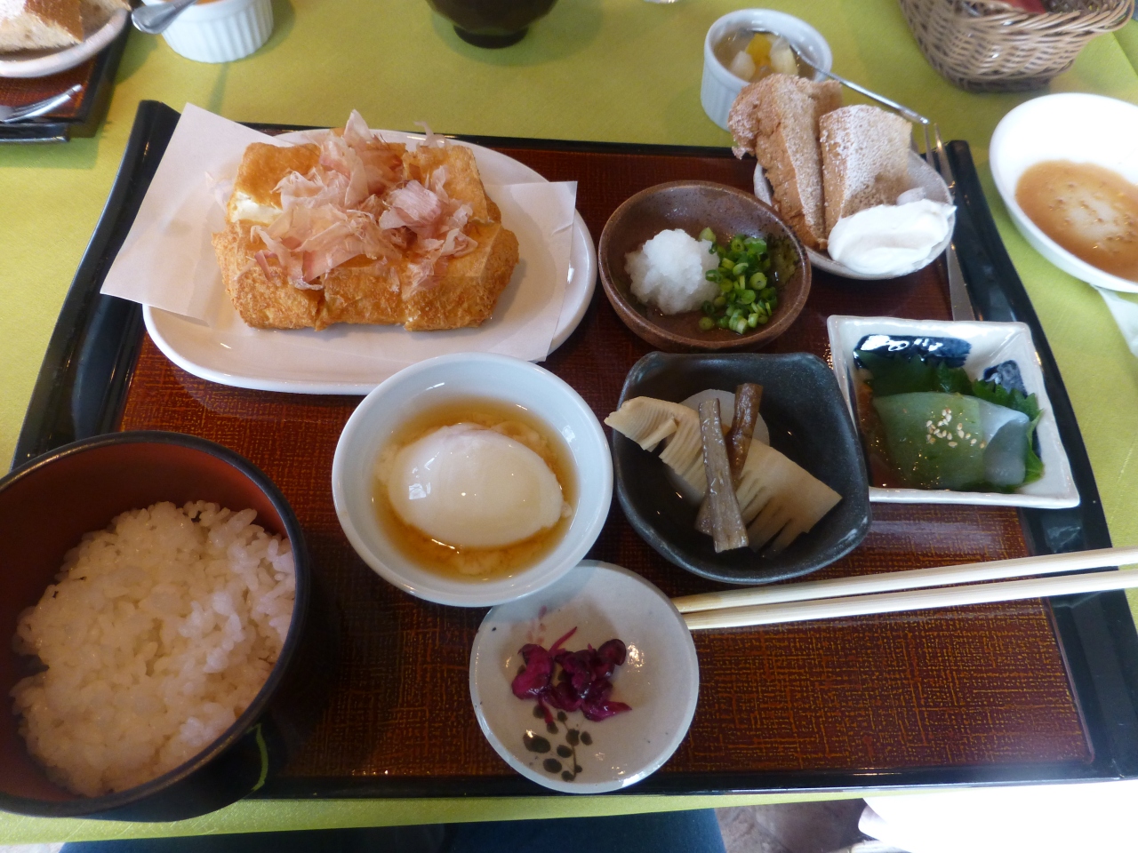 注文した厚揚げの定食は温泉卵や煮物などがありちょっと朝食のような感じでしたが
