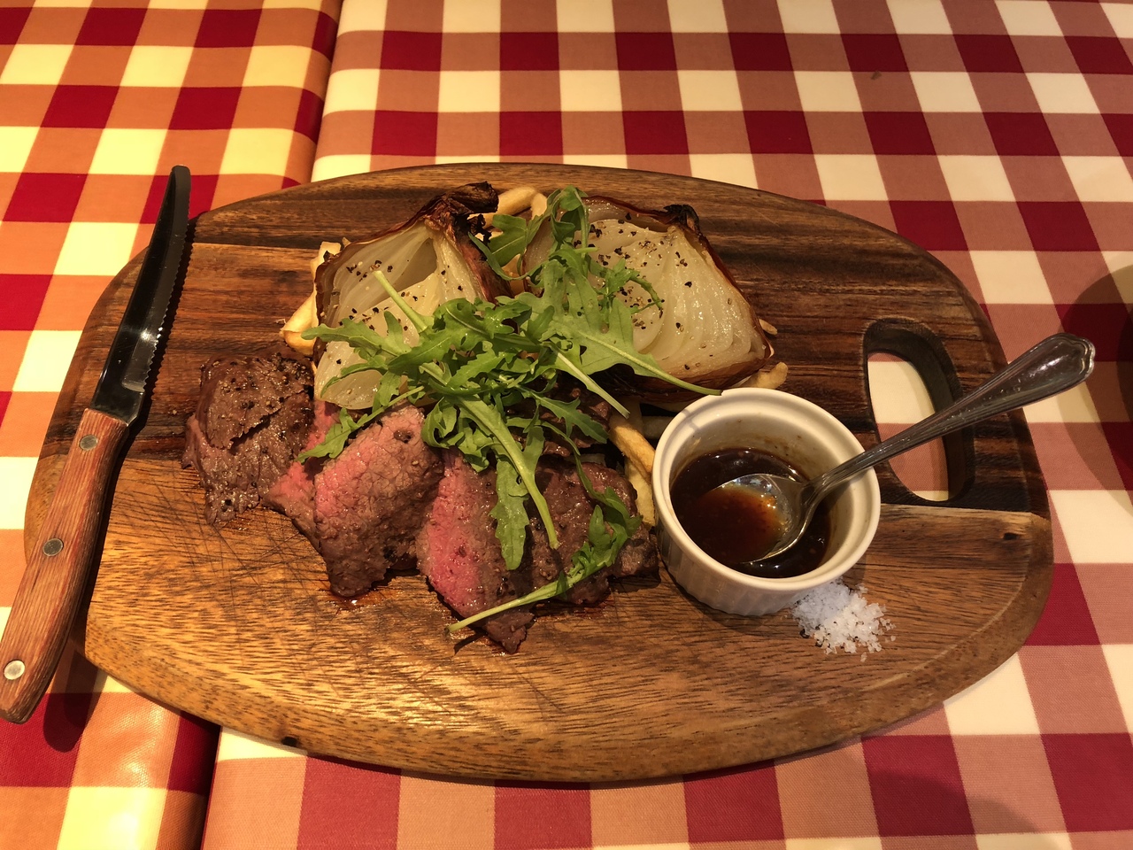 ステーキはカットされて提供されます。添えつけのソースか粗塩でいただきます。丸ごと玉ねぎのローストも甘くて気に入りました。ポテトフライは冷めても美味しかったです。