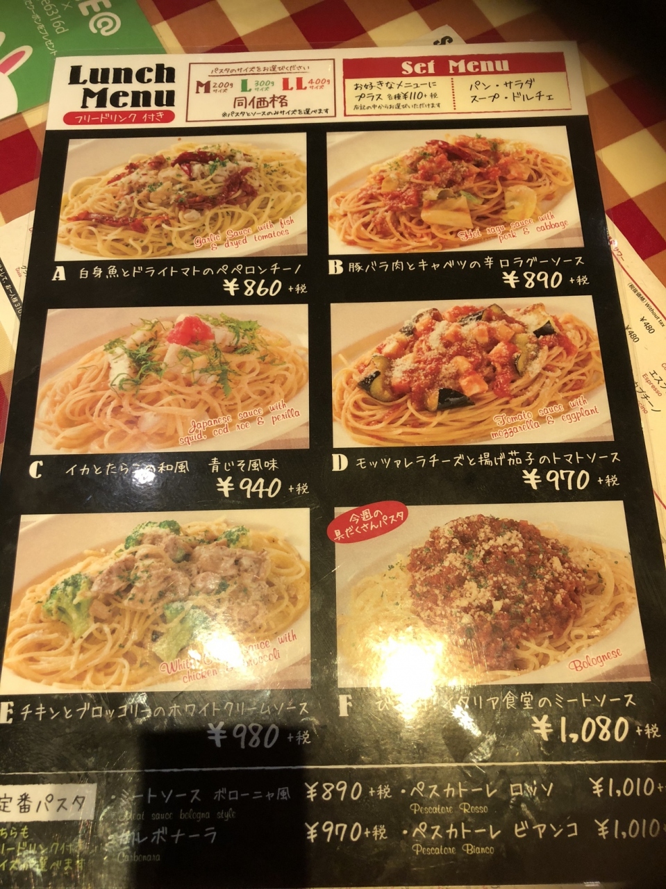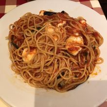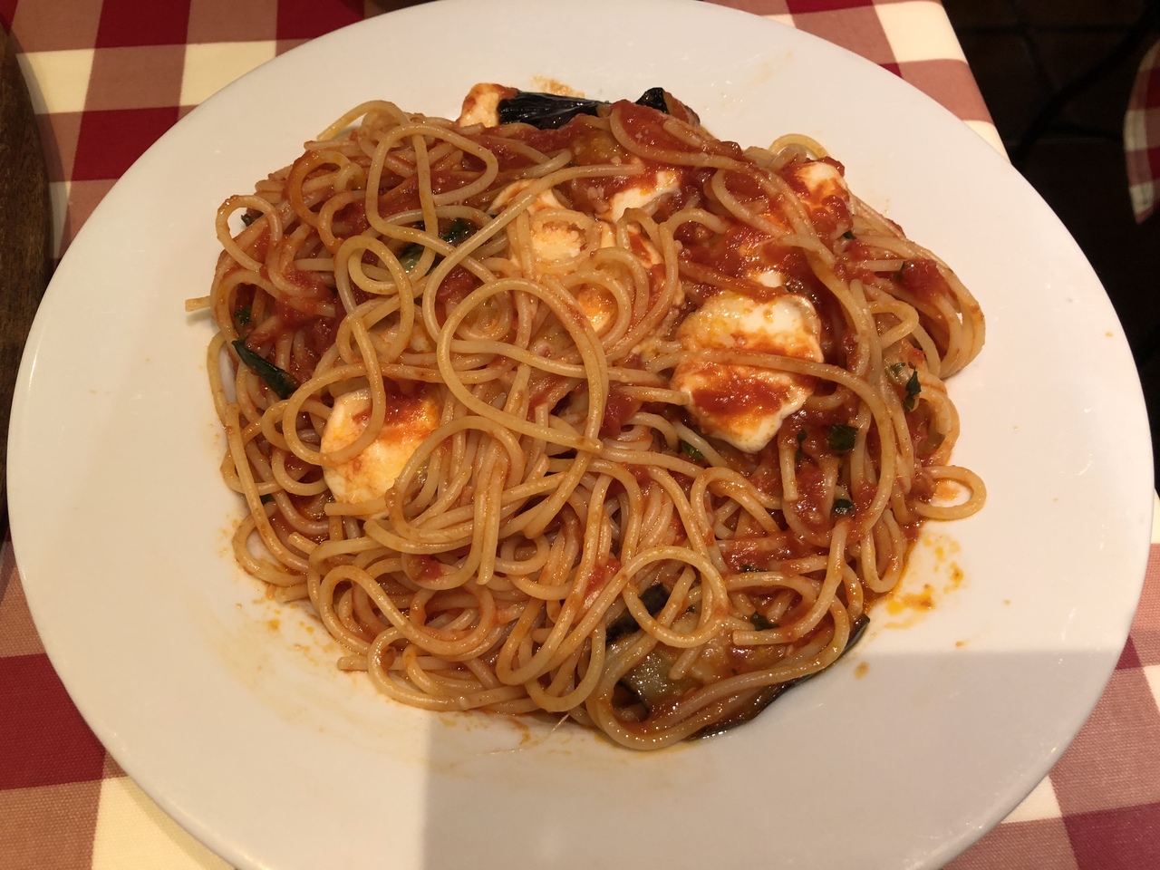 Dランチ:モッツァレラチーズと揚げ茄子のトマトソース 970円にプラス110円でサラダをつけました。パスタのサイズは同価格で、M200g、L300g、LL400gから選べます。迷わずLL400gを選択。量に対してお皿が小さかったのが残念。あとモッツァレラがもう少し入っていると良かったです。(パスタとソースのみサイズアップの意味がわかりました)