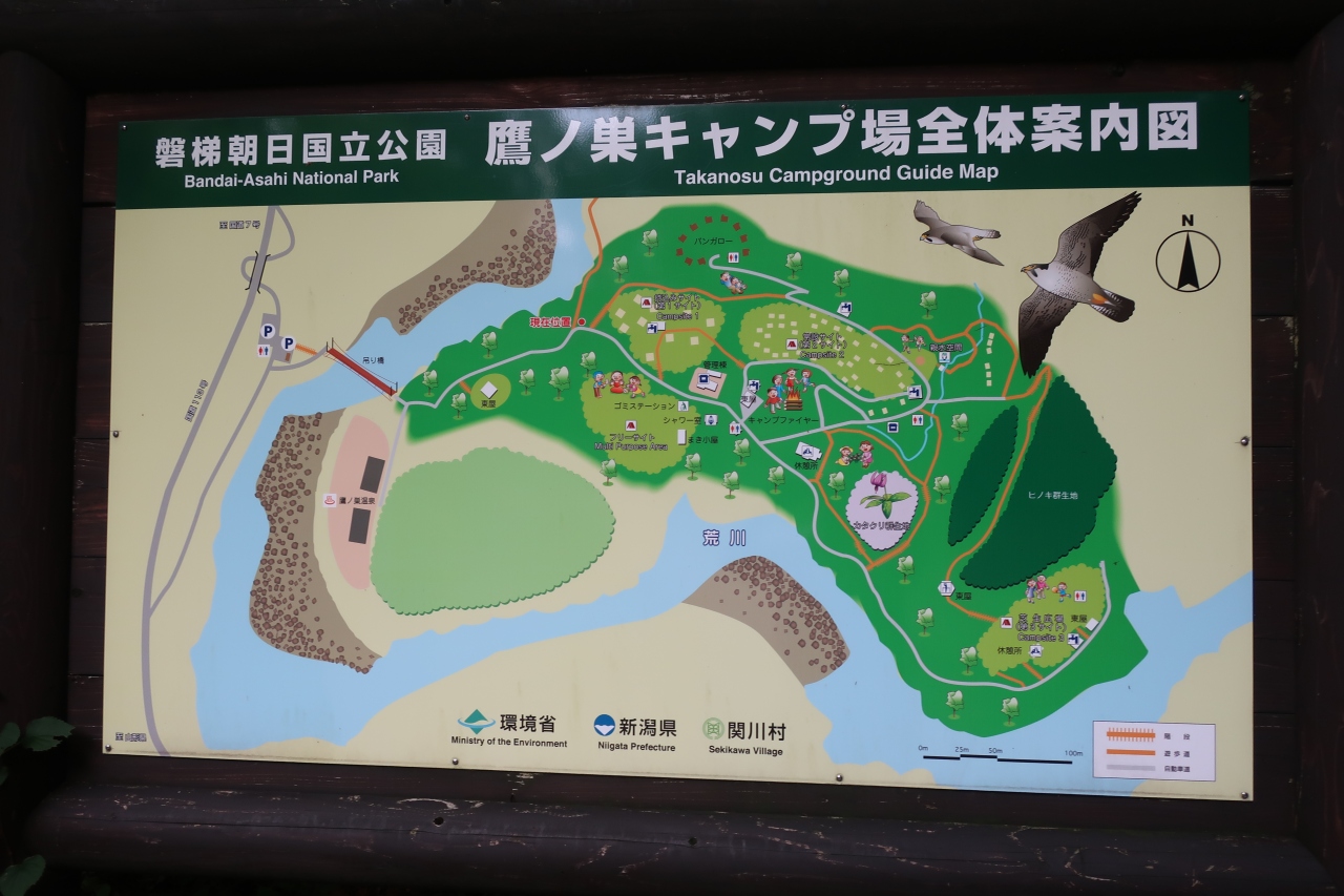 鷹ノ巣吊り橋を渡って直進し、緩やかな坂を上った先に鷹の巣キャンプ場があります。吊り橋前の駐車場から5分程掛かります。キャンプ場は緑の木々の中にあり、管理棟を中心として常設テント、バンガロー、炊事場、広場等があり、とても整備されたキャンプ場です。キャンプだけではなく、林の中等を散策して歩くのにも適しています(鷹ノ巣遊歩道は石がゴロゴロして歩きにくい)。欠点は車を乗り入れられないので、荷物を運ぶのが面倒な点です。ですが、逆に言うと騒音もなく自然を満喫できるキャンプ場です。