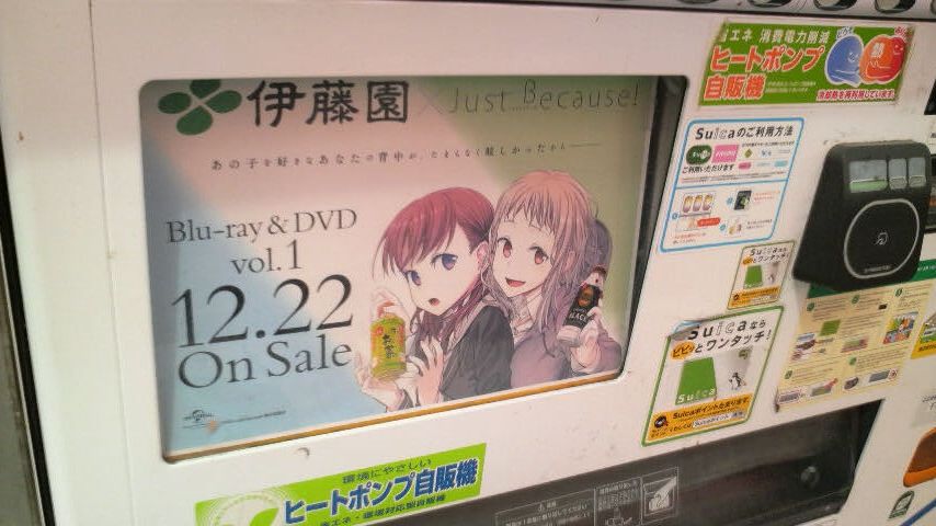 (自販機の広告スペースにもアニメの宣伝が入ってたりと、意外な場所にもアニメキャラが入り込んでるのが印象的です)