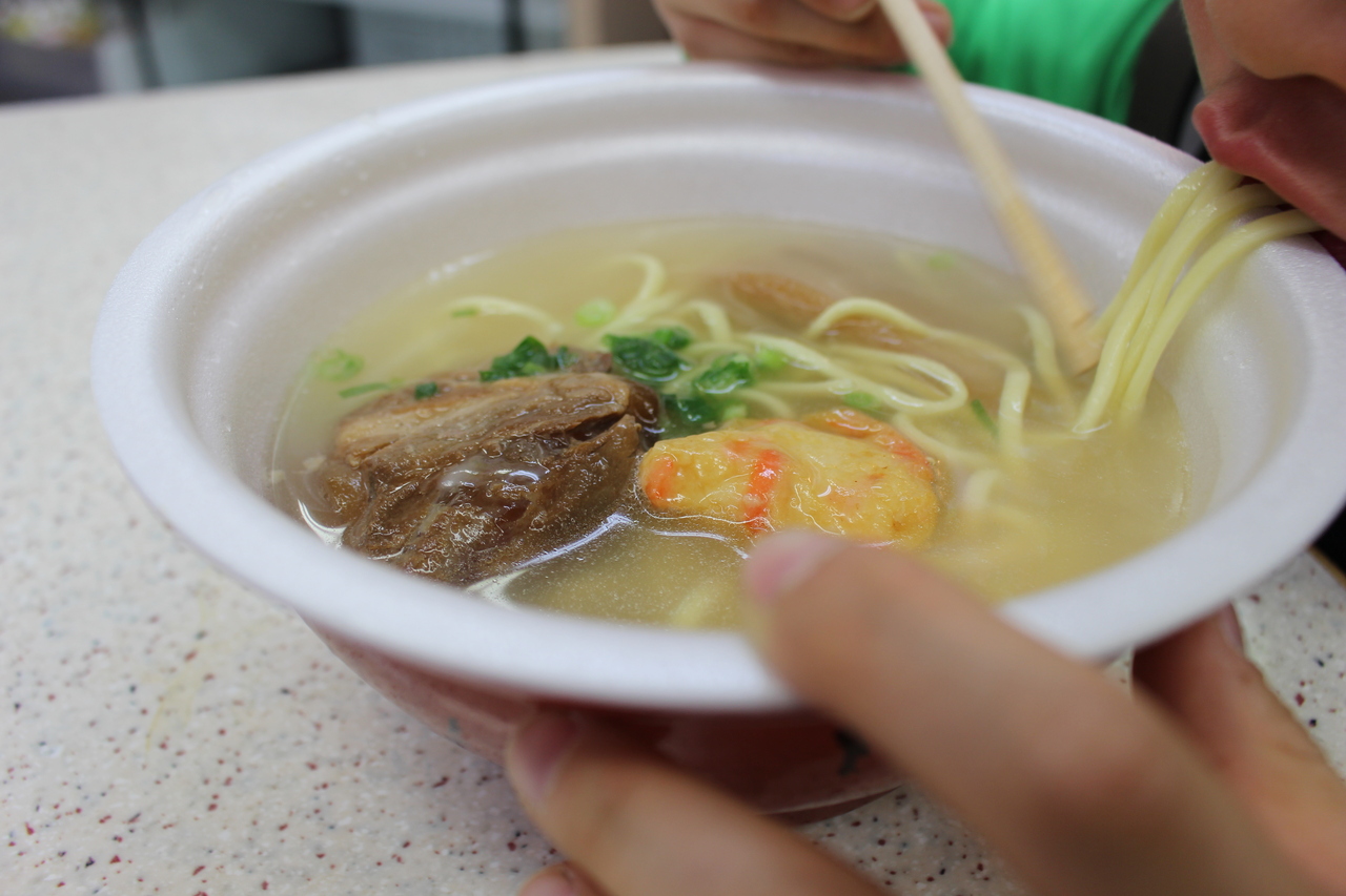 沖縄の玄関口、那覇空港のなかにある売店です。フライトが遅れたので、ブルースカイにて夕飯を食べることにしました。沖縄そばや何故か札幌ラーメンがありました。札幌ラーメン完売でしたので沖縄そばをいただけました。三枚肉おいしかったです。