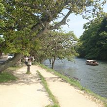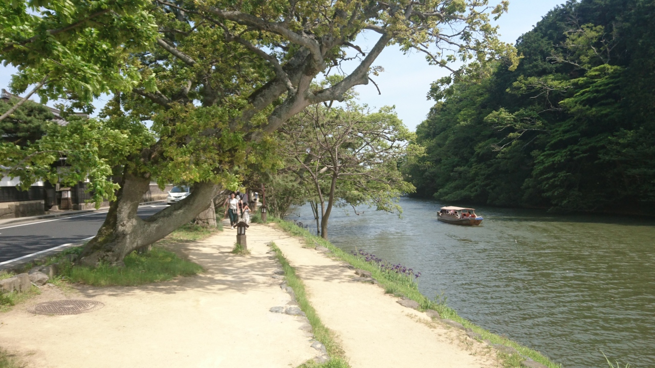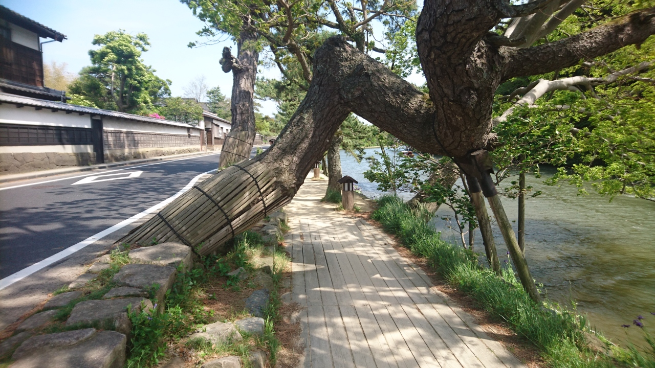 松江城を見に行くときに塩見縄手に行きました。塩見縄手は松江城の北側、堀川沿いにある通りで武家屋敷の建物が建ち並んでいたり、松並木がありました。どちらも風情があり印象に残りました。また、松並木には堀端のくぐり松があり、塩見縄手の名所のひとつになっています。