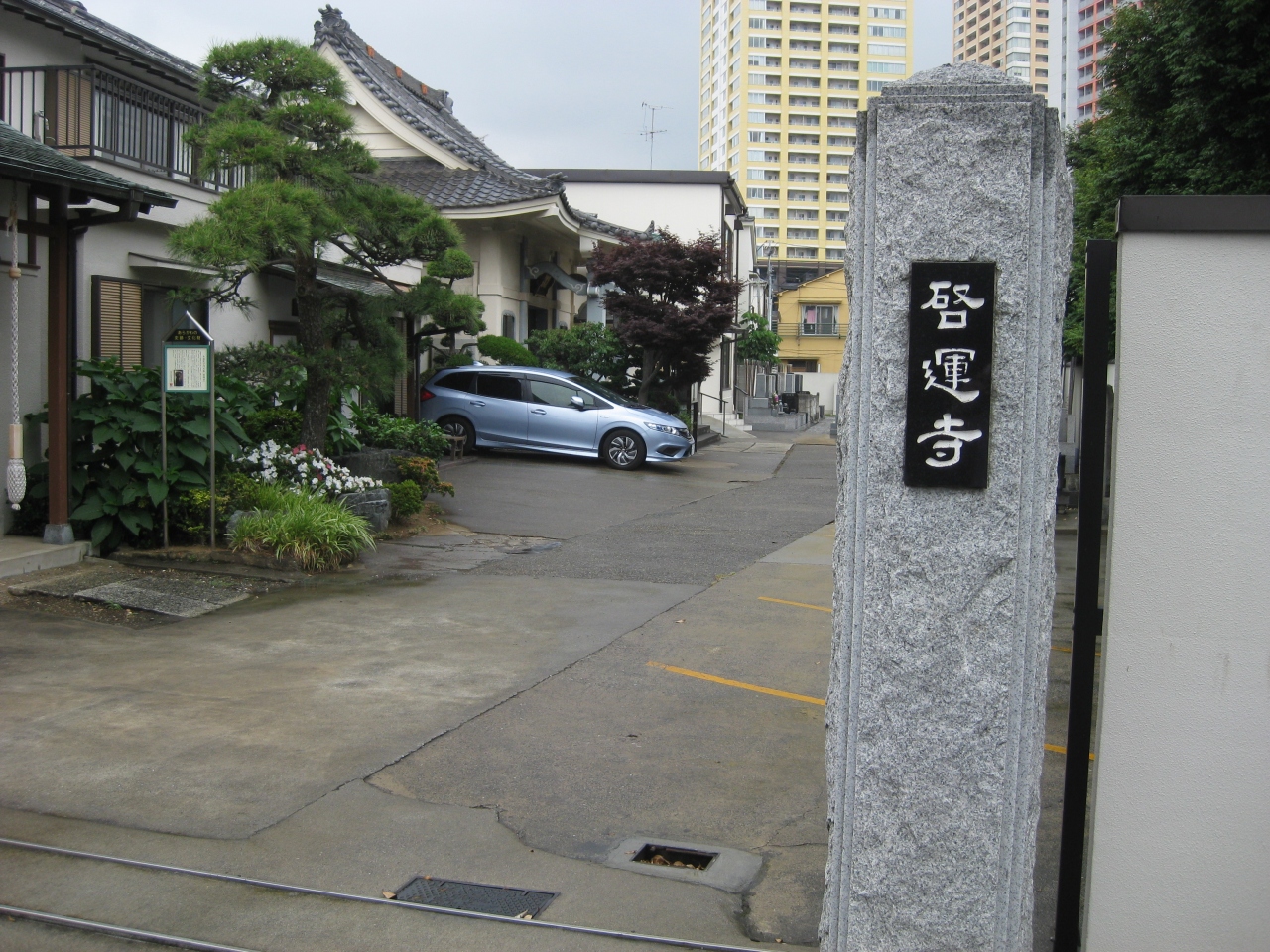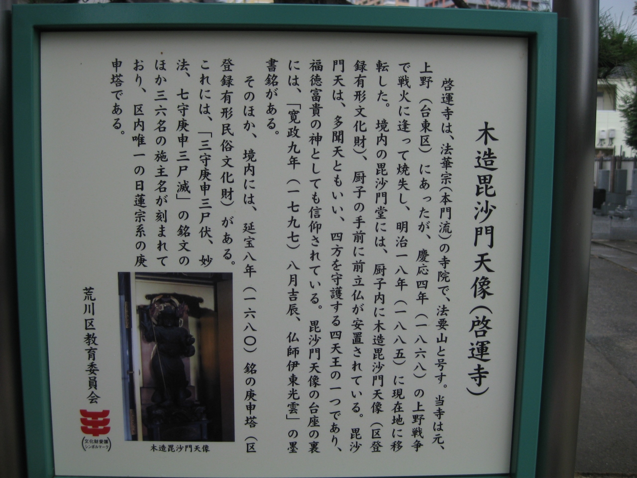 谷中御殿坂四つ角から西日暮里公園に続く諏訪台通りに面して建つ法華宗本門流寺院。元和元年(1644年)に下谷1丁目に創建されその後移転して明治18年当地へ移転したそうです。所蔵の木造毘沙門天像と庚申塔が荒川区登録文化財になっています。山門、境内、本堂と現代風でチョット残念です。