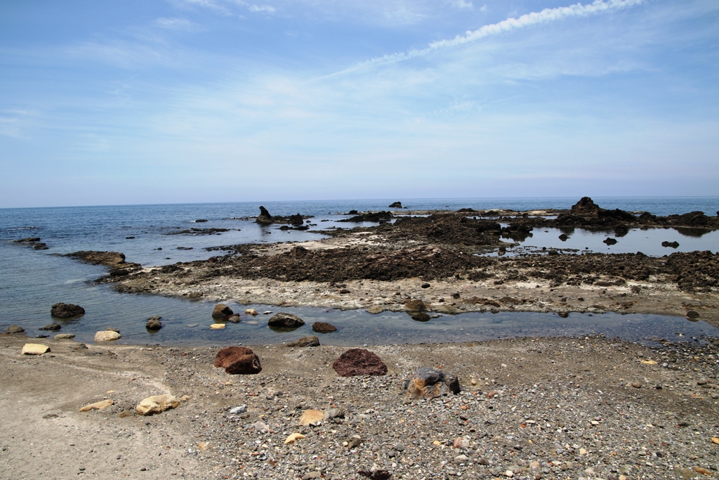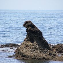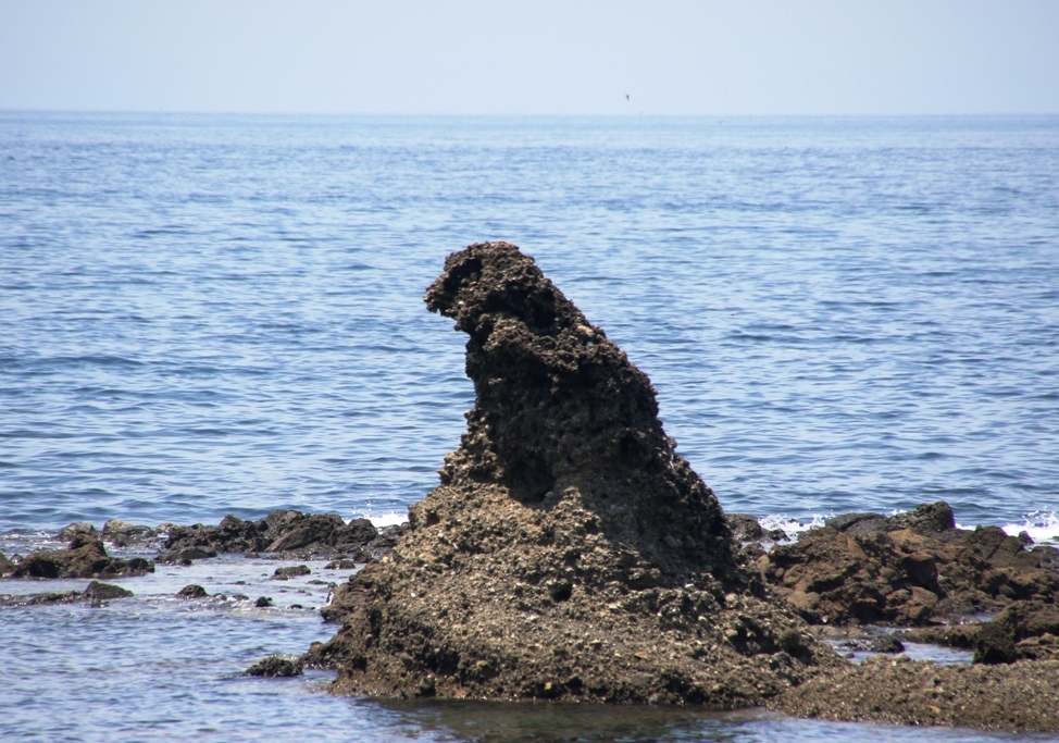 能登半島の最先端禄剛埼灯台に行く途中道路に掲示板があり道路脇のゴジラ岩専用駐車場に車を置いて写真を撮りました。干潮時なら歩いてゴジラ岩の近くまで徒歩で行くこともできます。私は猛暑で疲れ気味だったので望遠で写真を撮りました。
