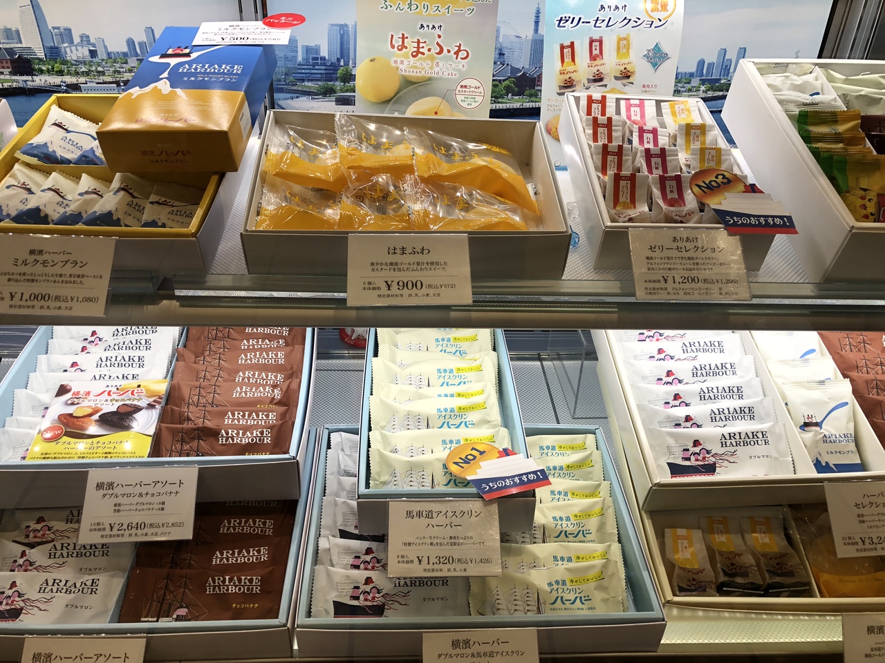 JR桜木町駅直結のシャル桜木町にありあけのショップが入っています。ありあけのお菓子はけっこうあちこちで売られているのですが、バリエーションの豊富さは直営店ならでは。
