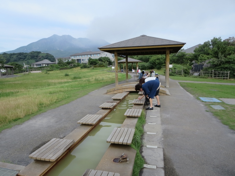 溶岩なぎさ公園の中にとても長い足湯がありました(日本一長い足湯と看板に書いてあったような気がします)。ややぬるめでしたが、錦江湾を見ながらのんびりすることができて良かったです。後ろ側から噴煙が上がり、散策路には灰がたまっていて桜島を実感しました。