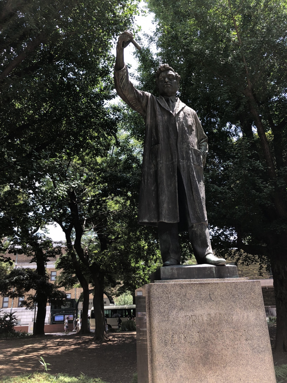 上野恩賜公園(上野公園)の国立科学博物館前の森の中に建っています。試験管を手にした研究者らしい像です。
