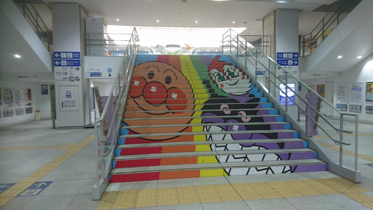 高知に旅行したときに、JR高知駅に行きました。ホームに上がってみると、大きなドーム屋根がありました。柱の無い開放的なホームで印象に残りました。また、階段にはアンパンマンのイラストやぬいぐるみもありました。