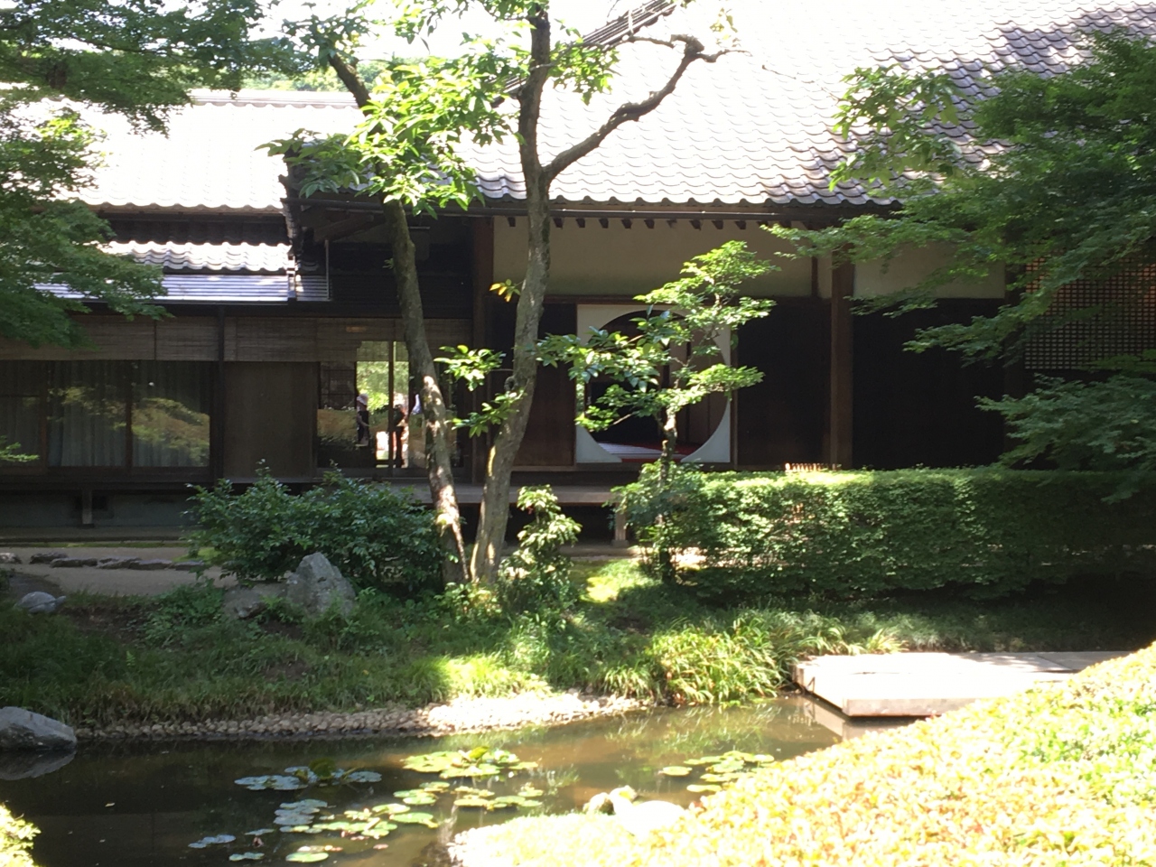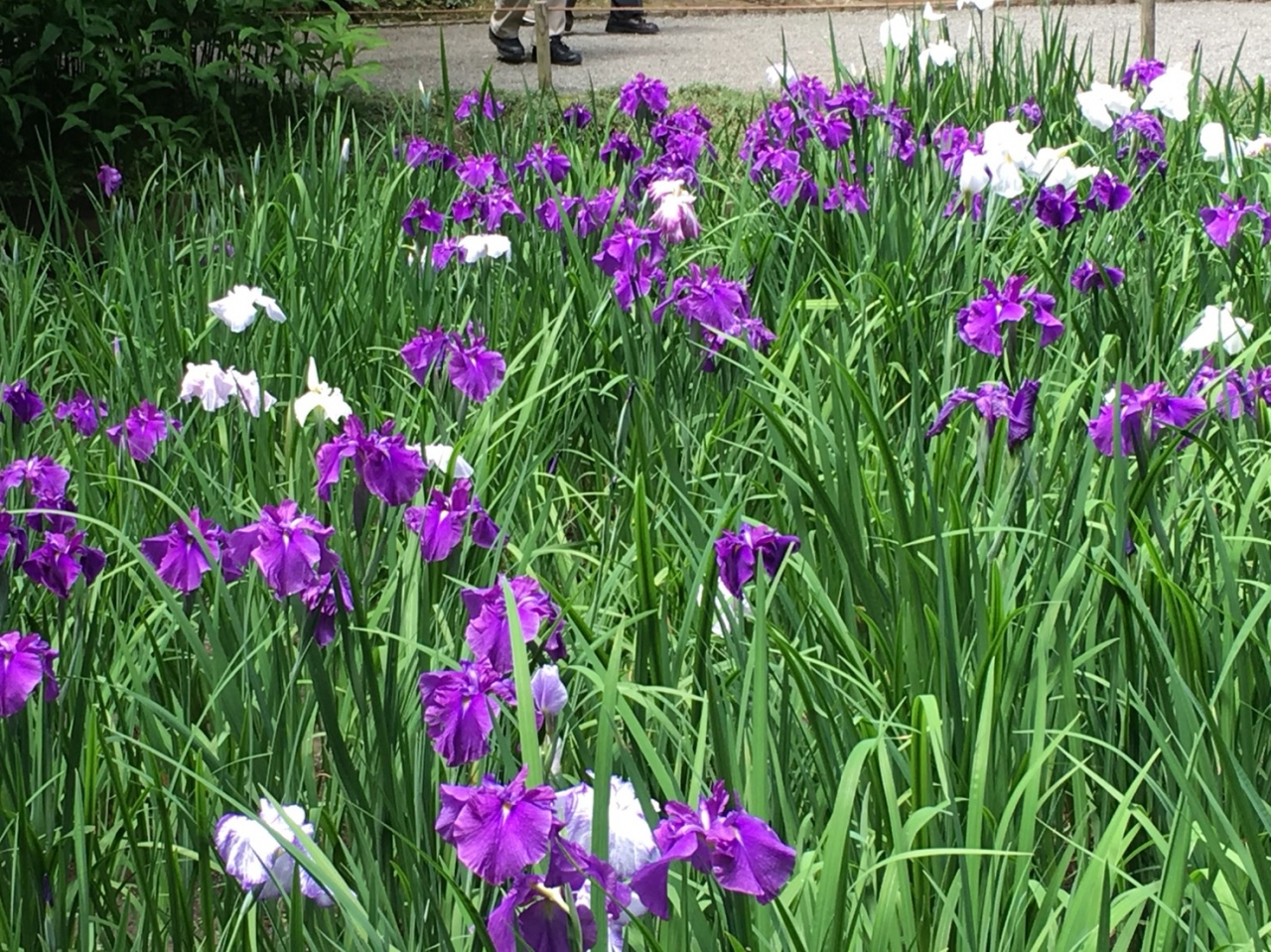 逆から丸窓が見えますが、写真を撮っている人のお邪魔になったらごめんなさい・・と思いながら進むと奥には見事な花菖蒲・・ベンチに座って暫く花菖蒲を見ながらゆっくりしました。