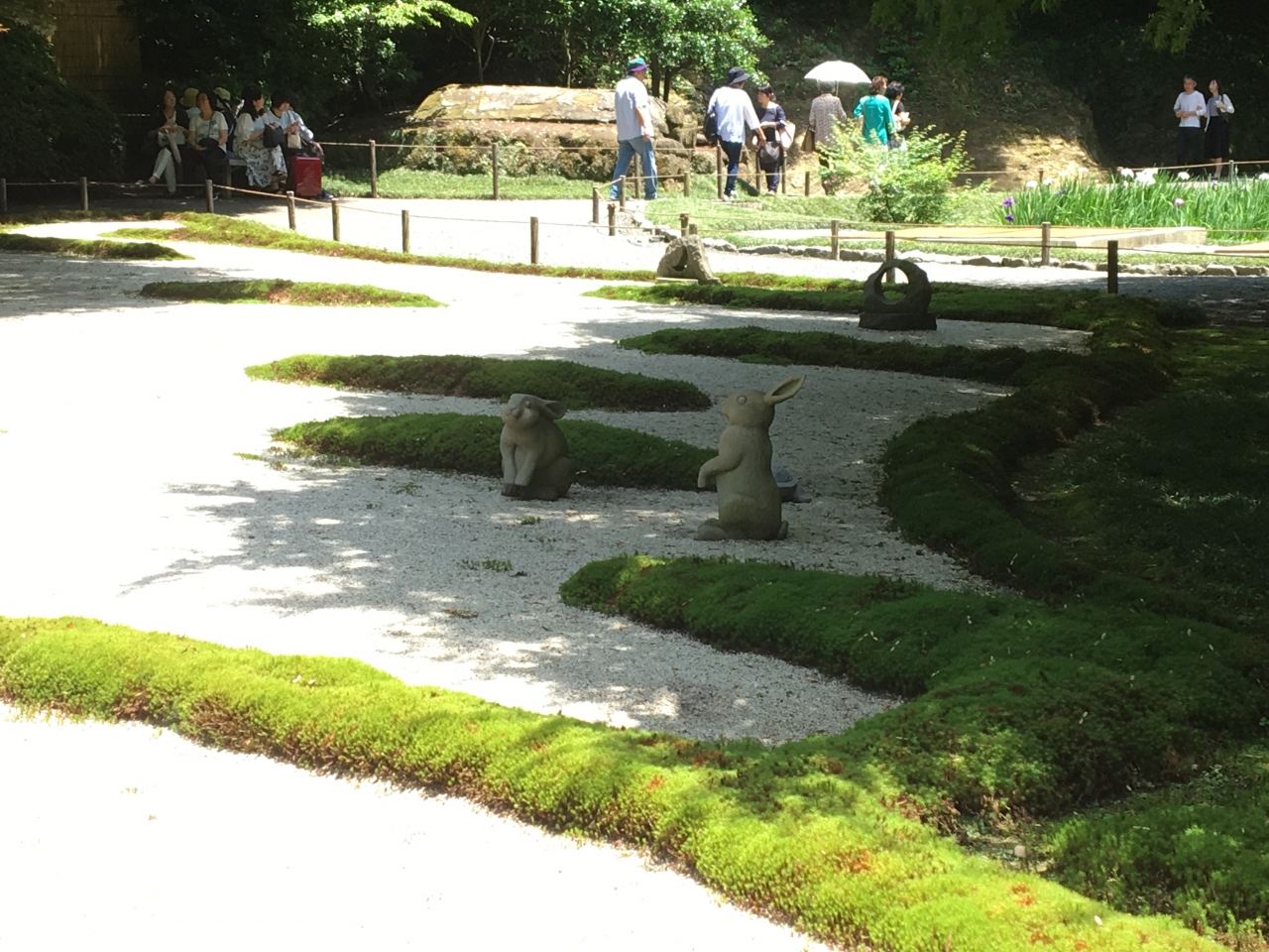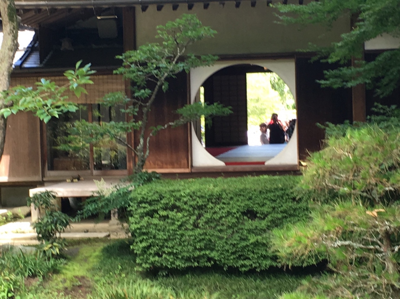 悟りの窓からの一瞬を狙う行列の向こうには、御朱印をもらう列。その間を縫うように進むと庭園の入口があります。