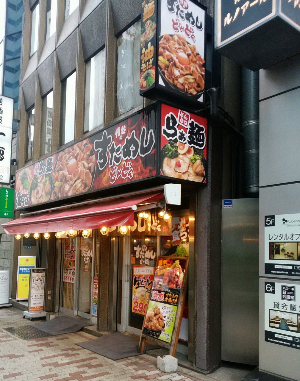新宿西口の小田急ハルクの近くにあるすためしのお店です。ガーリックがたっぷり効いた焼き肉が乗ったすためしはごはんの量も多く、お腹いっぱいになります。油そばやとんこつラーメンとのセットは、ボリュームたっぷりで食べきれないほどです。