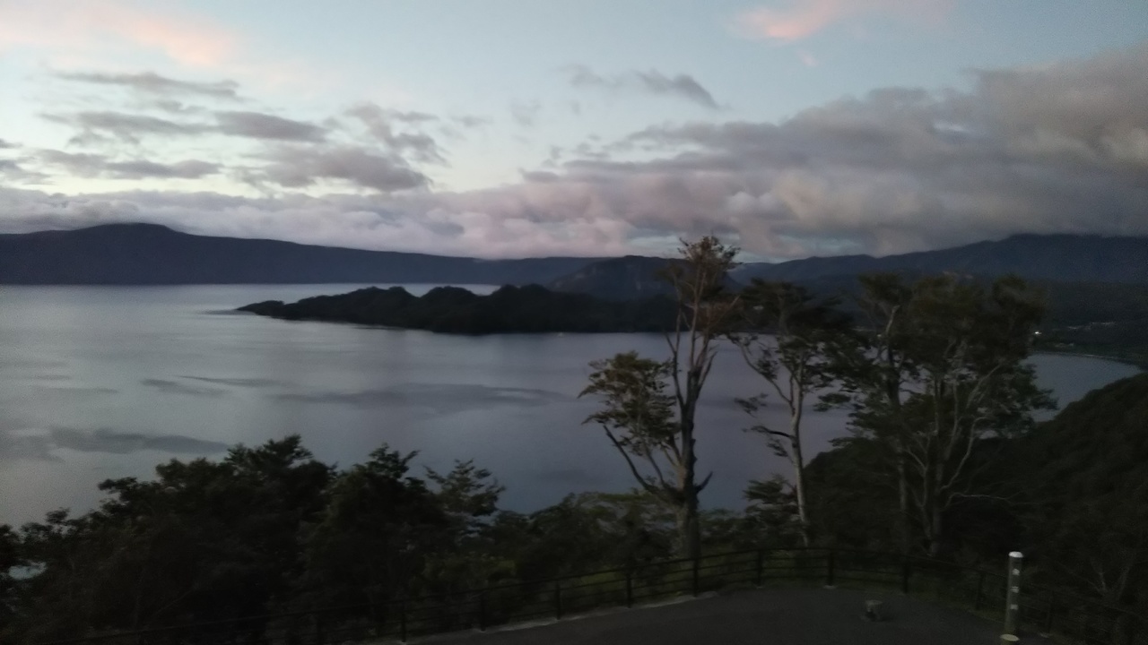東北自動車道から十和田湖を目指し、くねくねした山道を進むと下り坂の左手に展望台がありました。トイレ休憩を兼ねて立ち寄りました。日がくれる寸前の十和田湖を眺めることができました。天気も良かったので、気持ちがいい眺めでした。