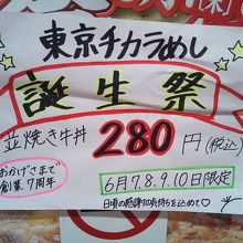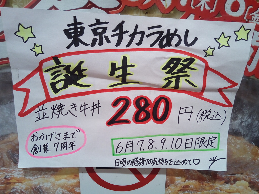 並の焼き牛丼が450円、定食も500円台から揃っていて安いです。6月初旬に創業祭で焼き牛丼が280円になっていた時に利用しました。