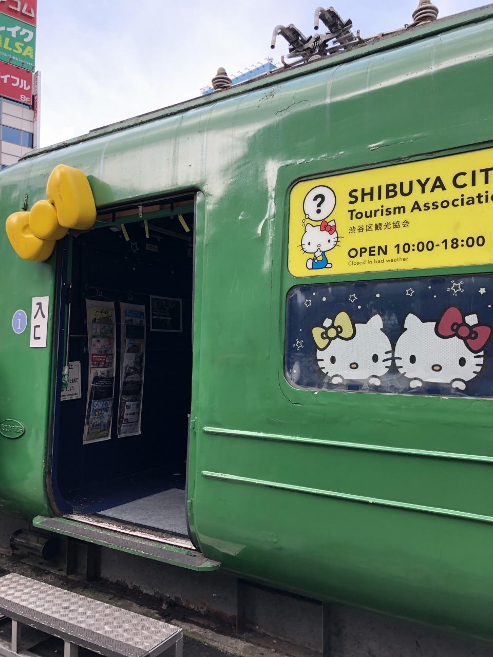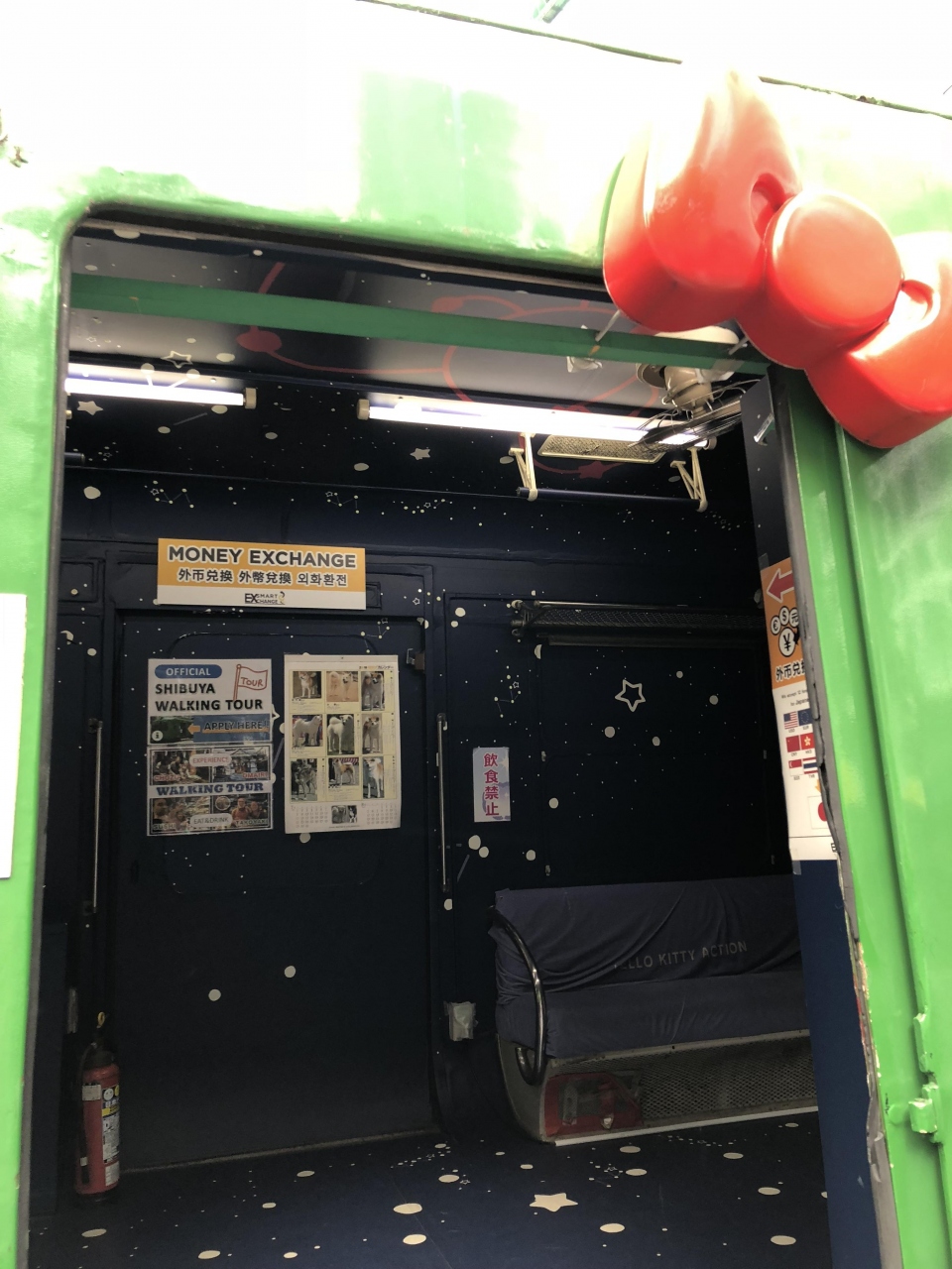 ハチ公の前にありますが、ハローキティのリボンがつけられたり、キティちゃんの人形が飾ってあったりと、キティちゃん仕様になっています。外貨の両替もできるようでした。古い電車の車両を十分再利用している好例ですね。