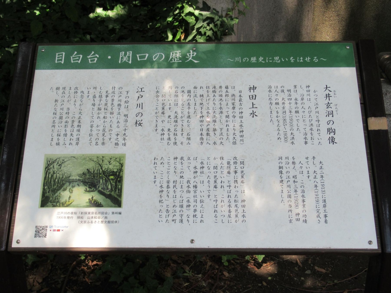 その説明板には、「大井玄洞の胸像」とともに「神田上水」と「江戸川の桜 (かつての挿絵付)」についても記してありとても役立ちます。