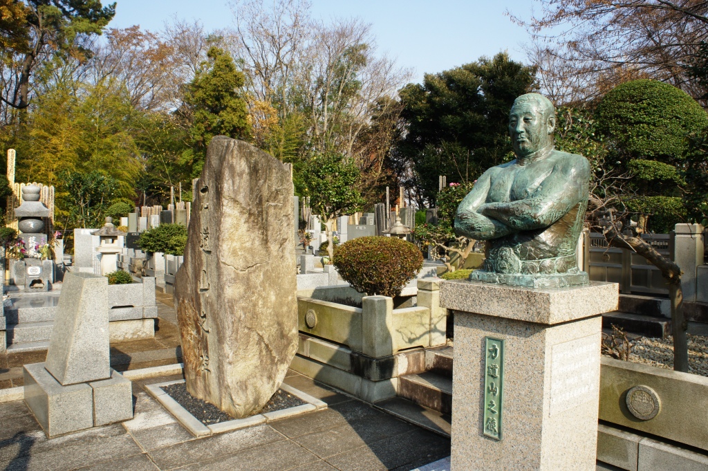 東京・池上本門寺で一番の人気スポットといえば力道山のお墓でしょう。平日だったけど十数人単位のグループなど、数少ない観光客の多くが見学に向かってました。歩くとすぐ分かります。立派な力道山のブロンズ像がありますから。空手チョップで一大プロレスブームを巻き起こした力道山は今なお人気が高く、命日にはこの墓に多くのファンが訪れるとか。とはいえ亡くなって53年。当時39歳の若さだったんですねえ。